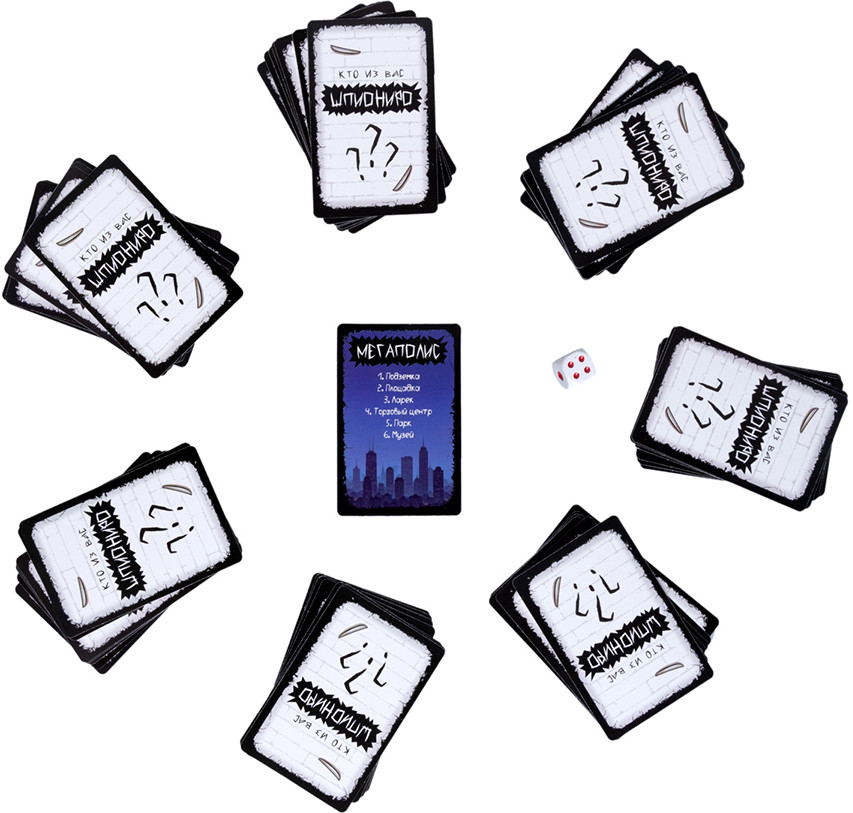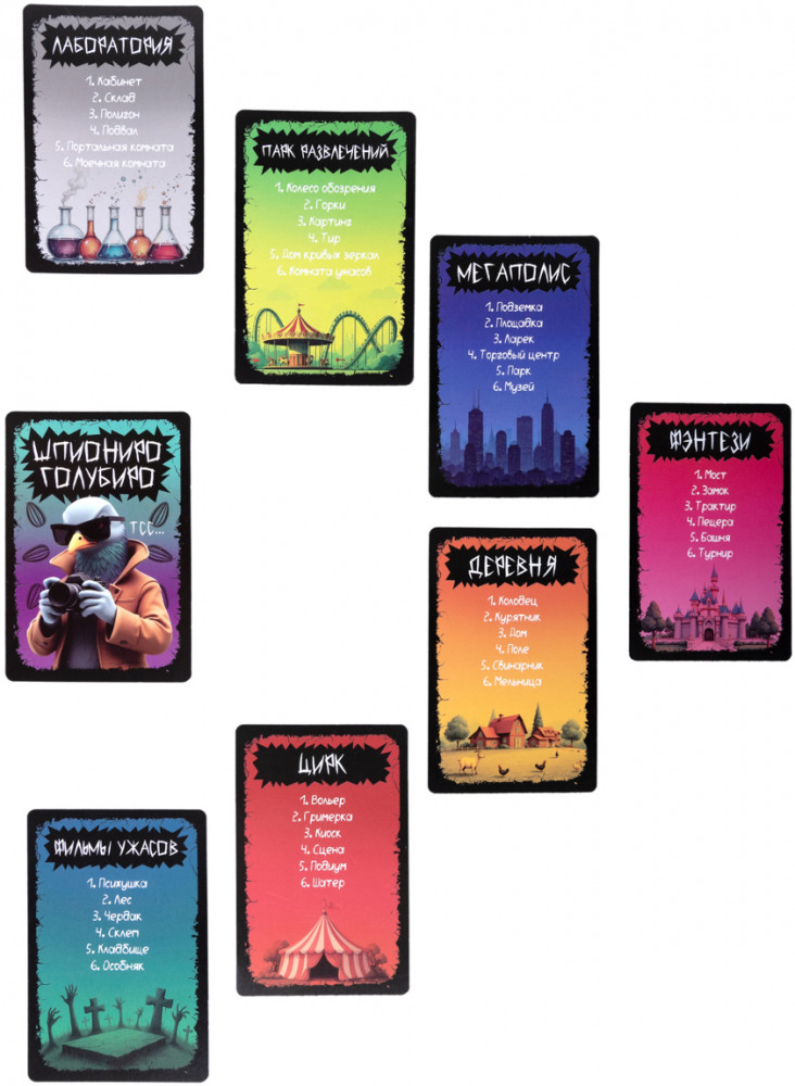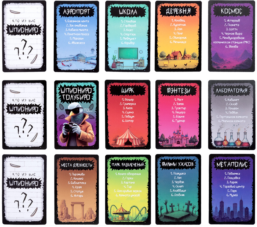 Тсс... вы с командой отправляетесь на секретное задание в одно интересное место. Но среди вас прячется хитрый шпион. Попробуйте вычислить его до того, как он раскроет ваш пункт назначения. А если шпион — это вы, постарайтесь втереться в доверие к другим игрокам и выведать у них секретную информацию. Возьмите лист бумаги и ручку, чтобы записывать баллы и решите сколько раундов будет длится игра. Разложите карточки по темам, должно получится 11 колод по 5 карт. Переверните колоды рубашкой вверх, поменяйте местами и выберите одну наугад. Ведущий смотрит какая выпала тема и сообщает остальным, пересчитывает всех игроков включая себя, оставляет в колоде на одну карту меньше и добавляет в нее карточку голубиного шпиона, перемешивает. Раздаем каждому игроку по одной карте которую видит только ее владелец. Ведущий бросает кубик, чтобы выбрать локацию для раунда на ваших карточках. Засекаем время на таймере 6-7 минут в зависимости от количества игроков.
