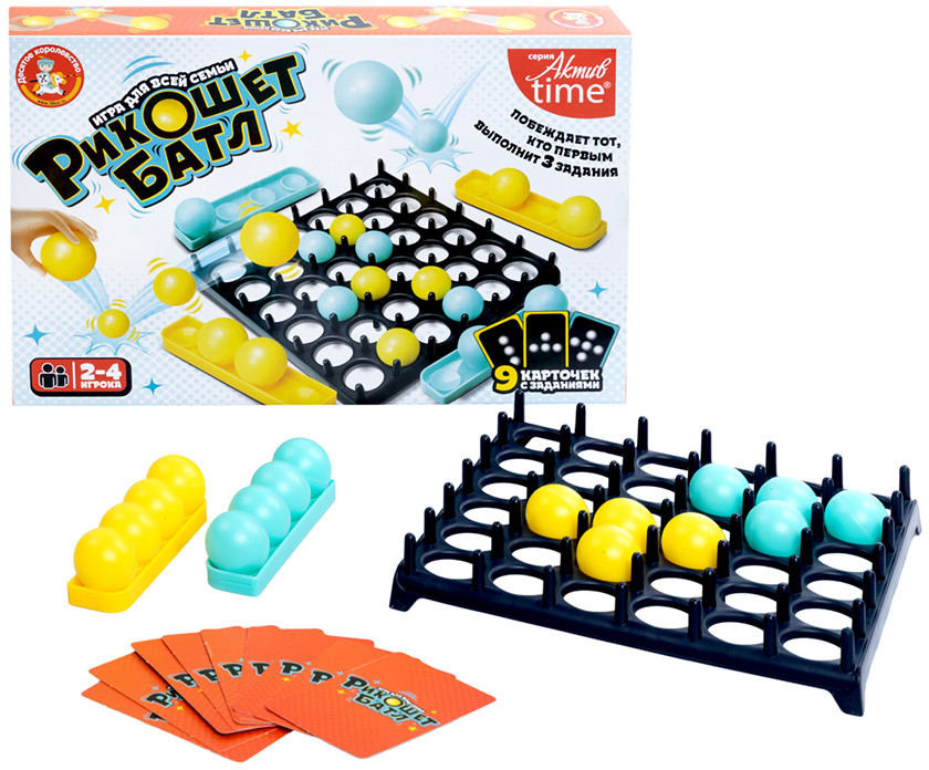 Настольная игра «Рикошет Батл» — это динамичная и увлекательная настольная игра на меткость и стратегическое мышление, где каждый бросок может стать ключом к победе. Погрузитесь в мир геометрических узоров и непредсказуемых отскоков, чтобы первым собрать три карты заданий и объявить себя мастером рикошета!