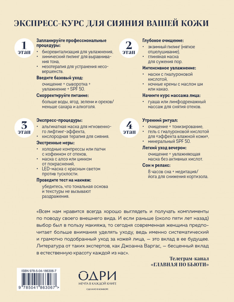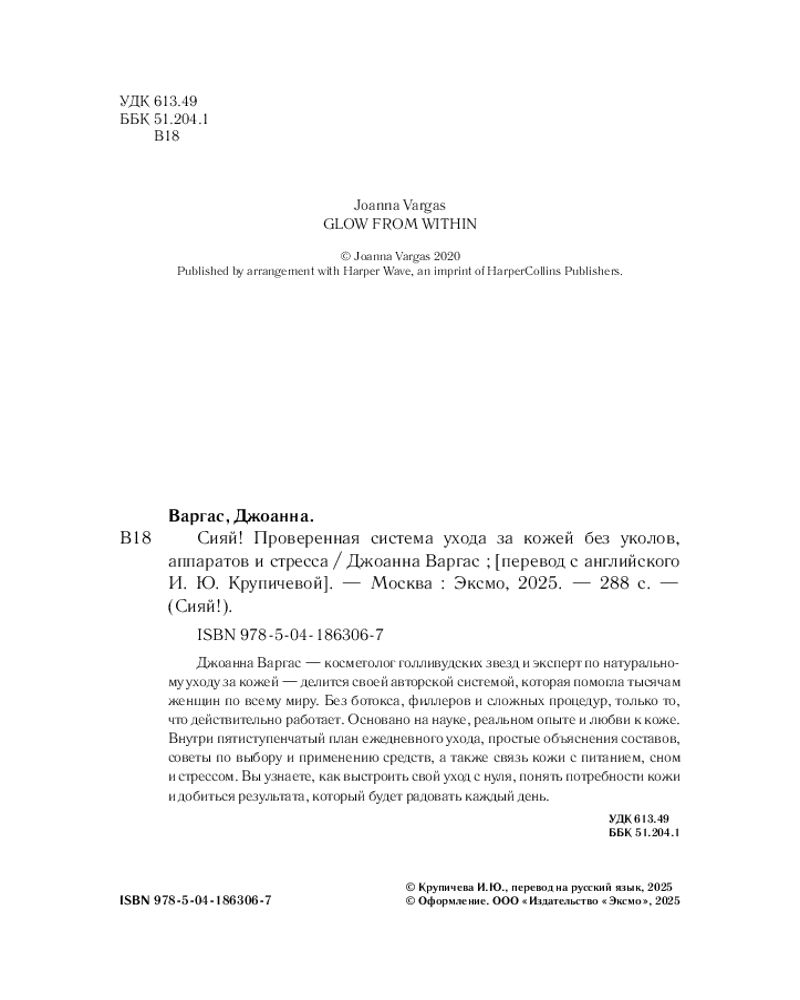 💳 Оплатить за товар можно при получении 🇰🇿 Есть бесплатная доставка по Казахстану от 1 дня 🎁 Копите бонусы с каждой покупки Серия: Сияй! Книги о красоте и заботе о себе Вы замечаете, что кожа тускнеет, теряет упругость или реагирует на стресс? Обычные советы не работают, а походы к косметологу не дают стойкого эффекта? Каждый день ваша кожа рассказывает, как вы спите, чем питаетесь и насколько заботитесь о себе. С помощью этой книги у вас есть возможность изменить состояние кожи — понять ее настоящие потребности, выстроить эффективный уход и добиться естественного, заметного результата. «Сияй!» — практическое руководство по уходу за кожей от Джоанны Варгас, звездного косметолога, которая работает с Джулианной Мур, Софией Копполой, Элизабет Мосс и тысячами женщин по всему миру. Впервые Джоанна делится своей натуральной системой, основанной на научных знаниях, опыте и внимании к каждому этапу жизни кожи. |