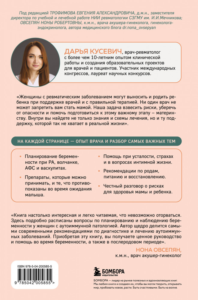 💳 Оплатить за товар можно при получении 🇰🇿 Есть бесплатная доставка по Казахстану от 1 дня 🎁 Копите бонусы с каждой покупки Серия: Мамы-блогеры. Советы по беременности и родам Как стать мамой, если у вас диагностировали ревматическое заболевание? Об этом непростом, но безопасном и верном пути от начала и до конца рассказывает Дарья Кусевич — ученый, врач-ревматолог с опытом клинической работы более 10 лет. Вы получите ответы на тысячу вопросов о планировании, беременности, родах и послеродовом периоде с ревмозаболеванием. Врач расскажет, что испытать счастье материнства РЕАЛЬНО, главное — правильная терапия. |