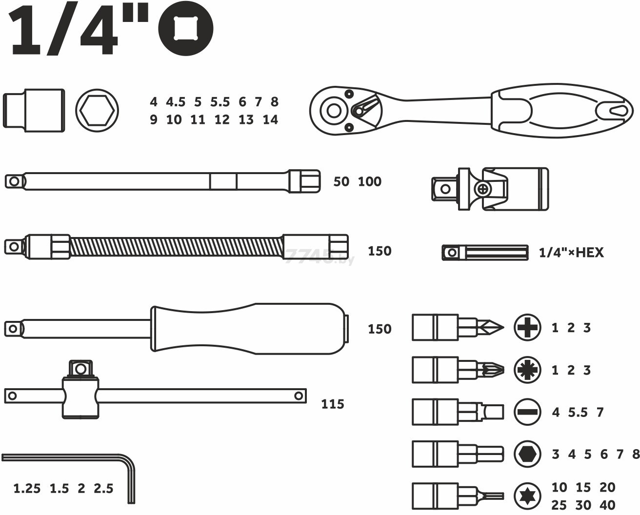 • головки торцевые 1/4: 4, 4.5, 5, 5.5, 6, 7, 8, 9, 10, 11, 12, 13, 14 мм;