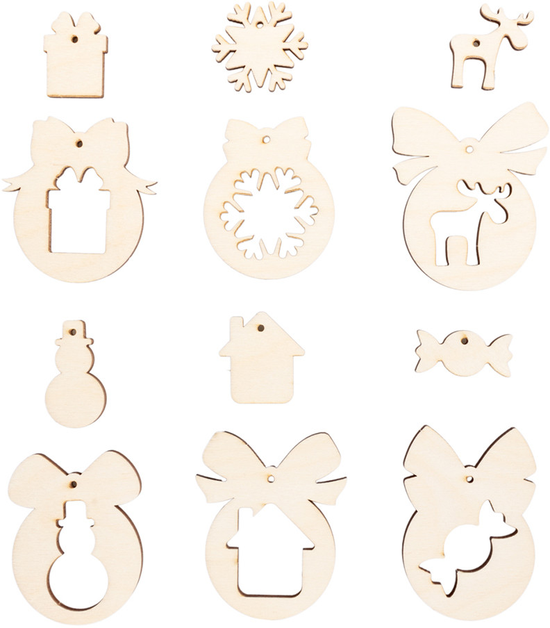 • заготовки игрушек из древесного материала (от 2,5 до 5,5 см) — 12 шт.;