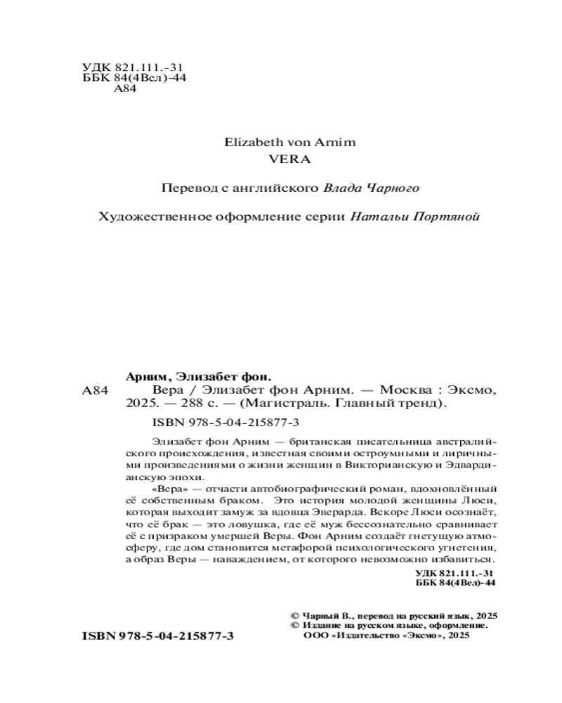 💳 Оплатить за товар можно при получении 🇰🇿 Есть бесплатная доставка по Казахстану 🎁 Копите бонусы с каждой покупки Серия: Магистраль. Главный тренд «Вера» — отчасти автобиографический роман, вдохновленный ее собственным браком. Это история молодой женщины Люси, которая выходит замуж за вдовца Эверарда. Вскоре Люси осознаёт, что её брак — это ловушка, где её муж бессознательно сравнивает её с призраком умершей Веры. Фон Арним создаёт гнетущую атмосферу, где дом становится метафорой психологического угнетения, а образ Веры — наваждением, от которого невозможно избавиться. |
