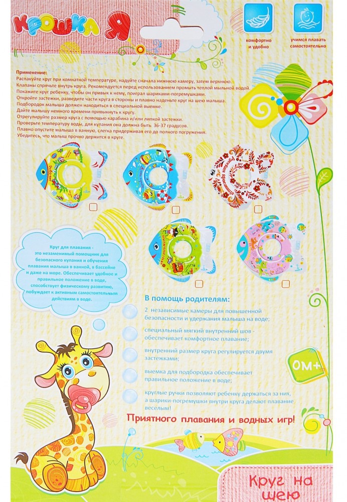 Крошка Я Круг на шею в форме рыбки «Русская красавица» от 0 мес, двухкамерный, с погремушкамиВ данный момент этот товар отсутствует в продаже. Возможно, у нас найдется аналогичный или похожий товар здесь. Круг на шею в форме рыбки с погремушками внутри предназначен для купания малышей с рождения в домашних условиях или на открытом воздухе на глубине не более 1 метра. Одетый на шею ребенка круг не доставляет малышу никакого дискомфорта, ввиду применения технологии "внутреннего шва", который делает края мягкими на ощупь. На внутренней стороне круга имеется вставка для подбородка ребенка, которая надежно фиксирует его положение и препятствует соскальзыванию. А благодаря двум раздельным контурам, надувающимся отдельно, создается дополнительная безопасность во время купания ребенка. |