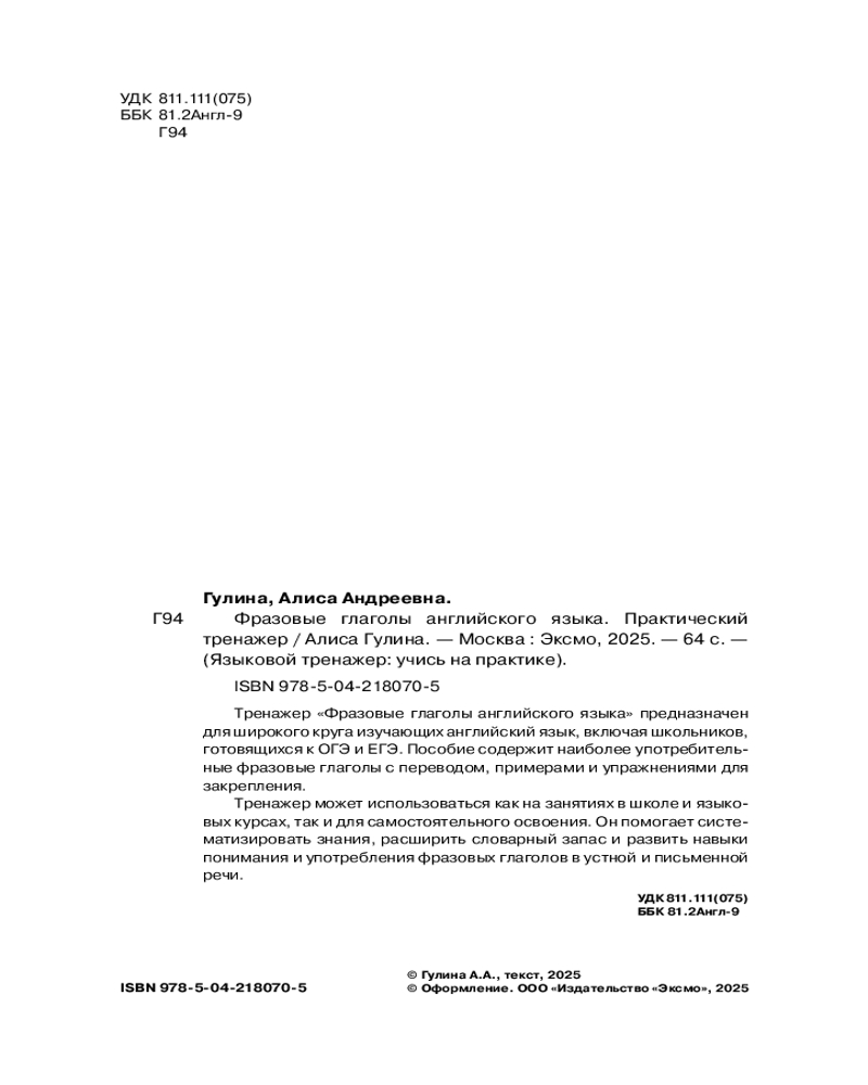 💳 Оплатить за товар можно при получении 🇰🇿 Есть бесплатная доставка по Казахстану 🎁 Копите бонусы с каждой покупки Серия: Языковой тренажер: учись на практике «Фразовые глаголы английского языка» — практический тренажер, который поможет вам уверенно овладеть одной из самых сложных, но необходимых тем английского языка. В книге собраны самые употребительные фразовые глаголы с переводом и примерами, а также упражнения для закрепления. Знание фразовых глаголов особенно важно при подготовке к ЕГЭ, где они встречаются в текстах для чтения, аудирования и в заданиях на использование лексики. Умение правильно их понимать и применять значительно повышает шансы на высокий балл. |