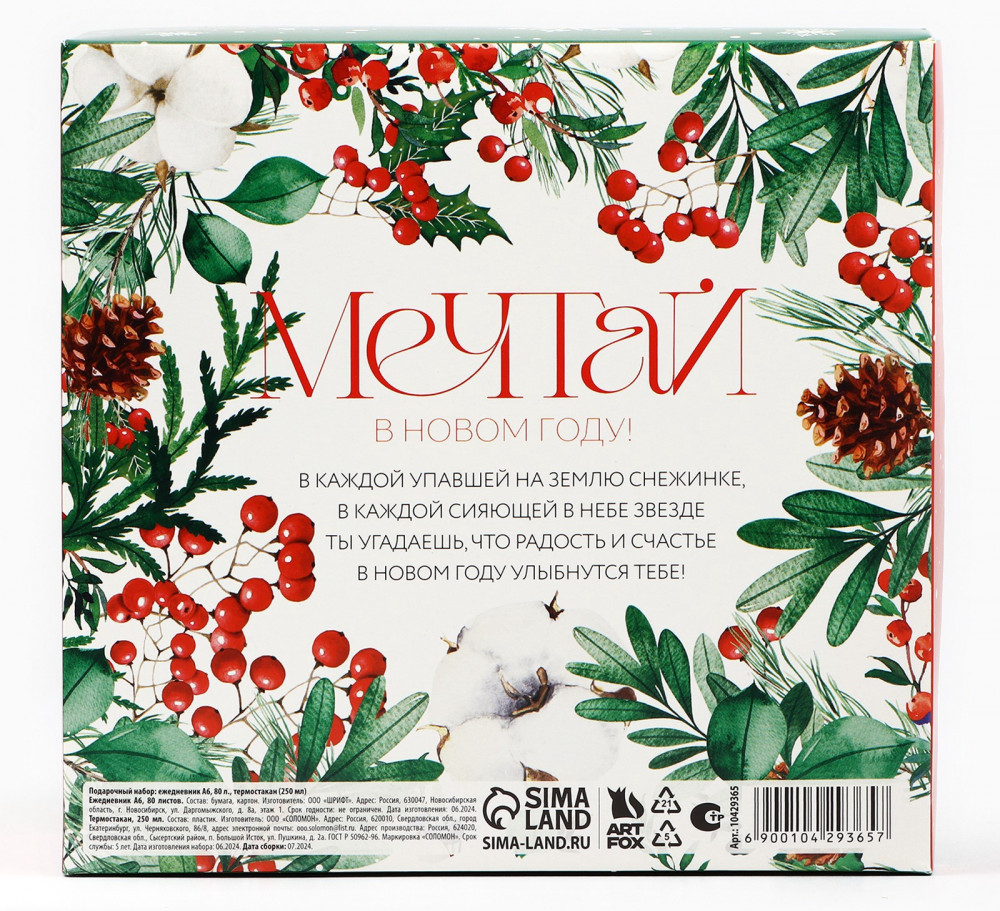 Подарочный набор новогодний «Мечтай в Новом году» (Artfox) — стильный и практичный подарок для коллег, друзей или близких. В набор входят ежедневник А6 на 80 листов и термостакан 250 мл, идеально подходящие для работы, учебы и уютного кофе-ритуала.