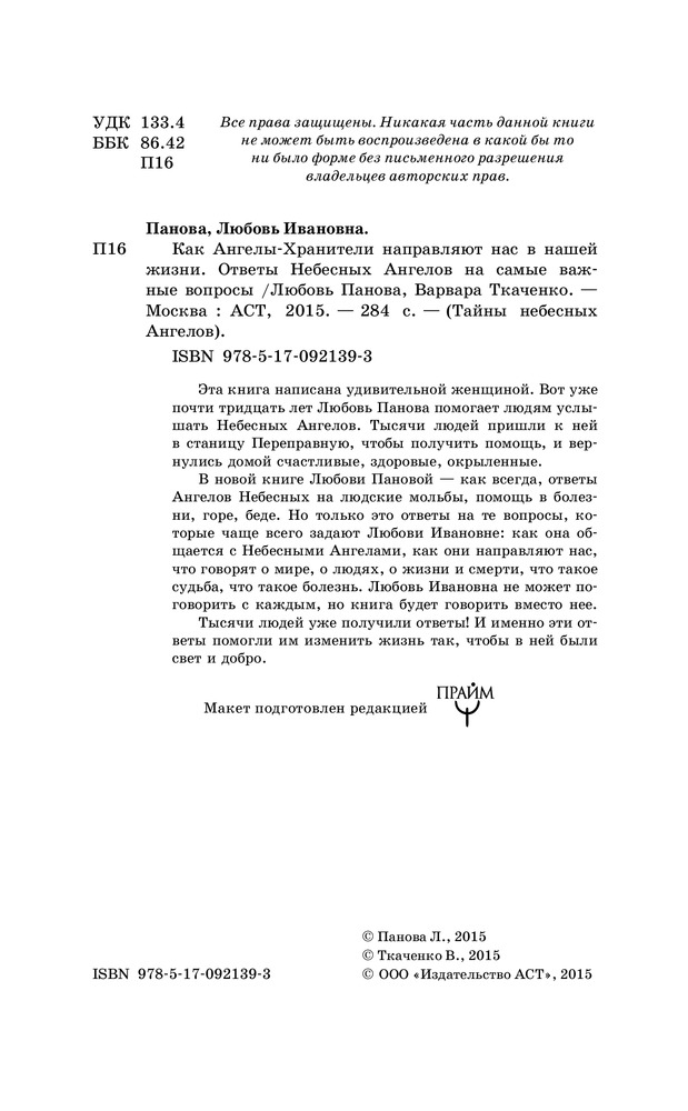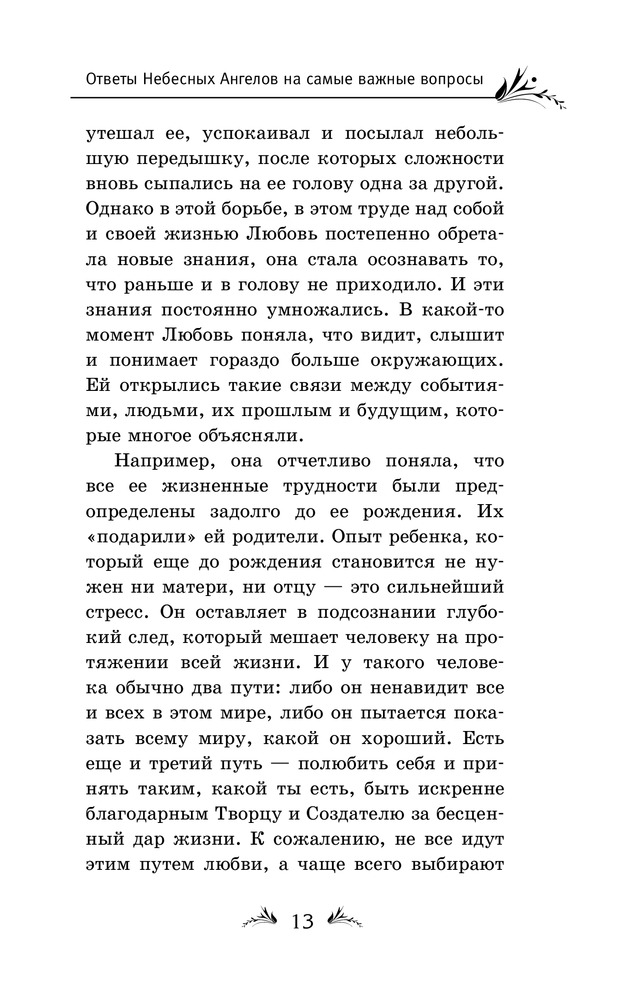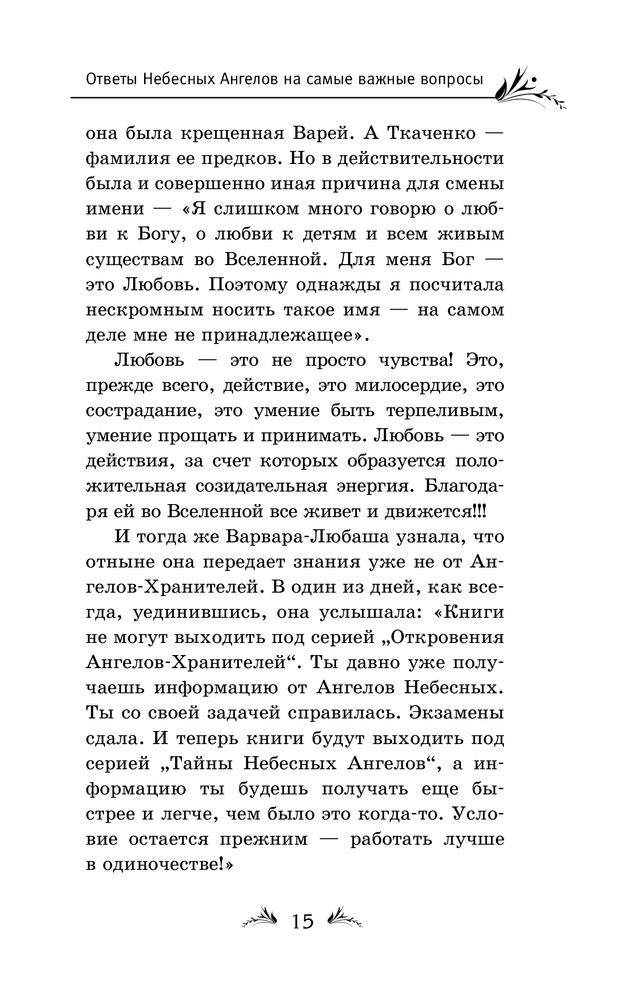 Как Ангелы-Хранители направляют нас в нашей жизни. Ответы Небесных Ангелов на самые важные вопросыВ данный момент этот товар отсутствует в продаже. Возможно, у нас найдется аналогичный или похожий товар здесь. Серия: Тайны небесных ангелов Эта книга написана удивительной женщиной. Вот уже почти тридцать лет Любовь Панова помогает людям услышать Небесных Ангелов. Тысячи людей пришли к ней в станицу Переправную, чтобы получить помощь, и вернулись домой счастливые, здоровые, окрыленные. В новой книге Любови Пановой — как всегда, ответы Ангелов Небесных на людские мольбы, помощь в болезни, горе, беде. Но только это ответы на те вопросы, которые чаще всего задают Любови Ивановне: как она общается с Небесными Ангелами, как они направляют нас, что говорят о мире, о людях, о жизни и смерти, что такое судьба, что такое болезнь. Любовь Ивановна не может поговорить с каждым, но книга будет говорить вместо нее. Тысячи людей уже получили ответы! И именно эти ответы помогли им изменить жизнь так, чтобы в ней были свет и добро. |