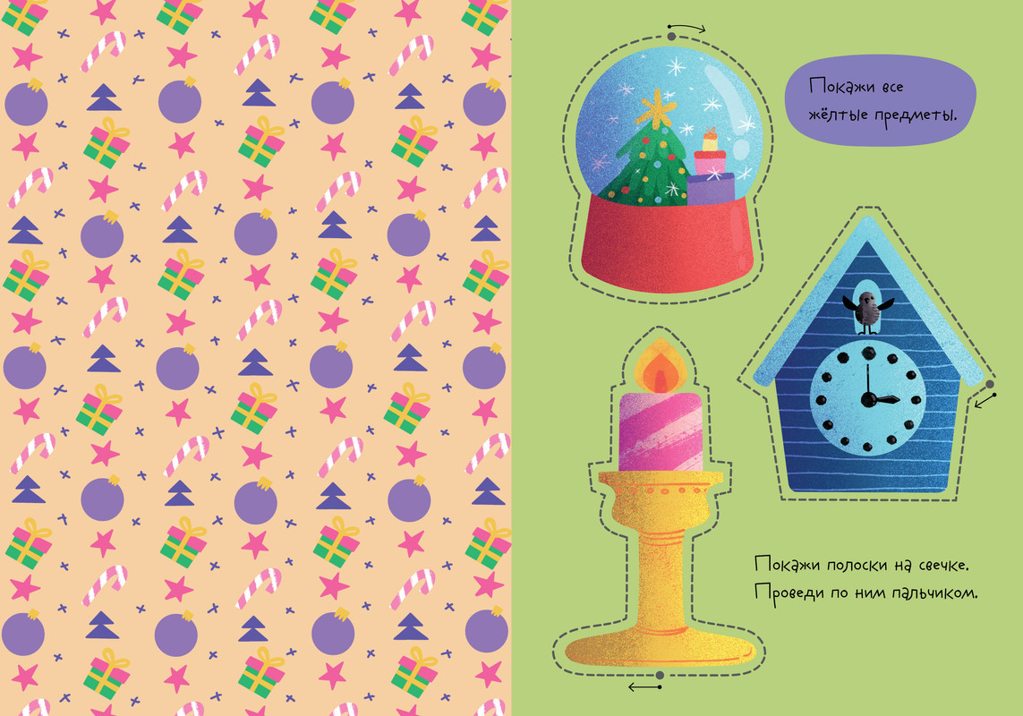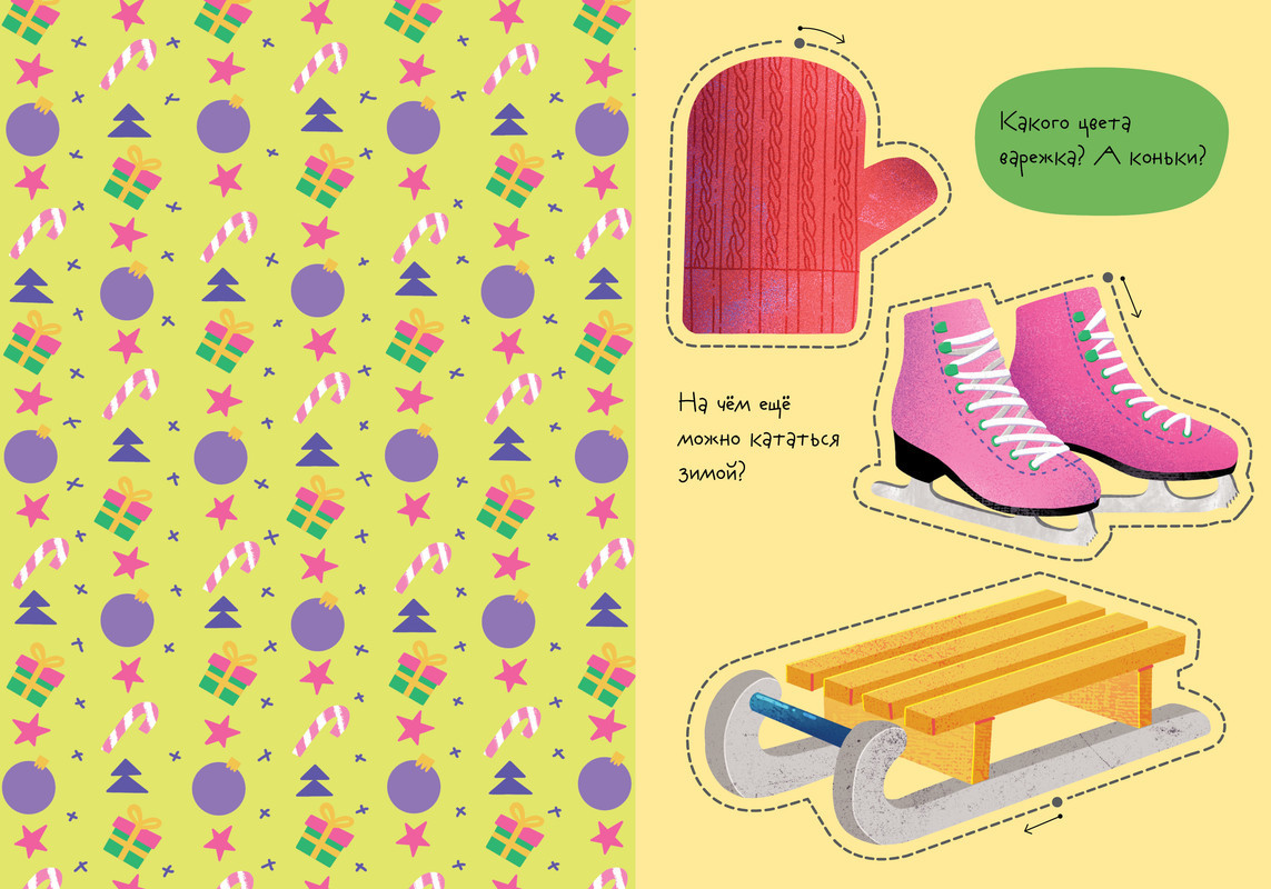 Книга, которая развивает и развлекает, — прекрасный новогодний подарок для детей. Здесь есть не только вырезалки, но и простые задания и вопросы на сообразительность. Например, нужно найти все желтые предметы на странице, вспомнить, на чем катаются зимой и рассказать, какого цвета шапка у снеговика. А вырезанные фигуры можно будет наклеить на бумагу и сделать новогоднюю аппликацию.