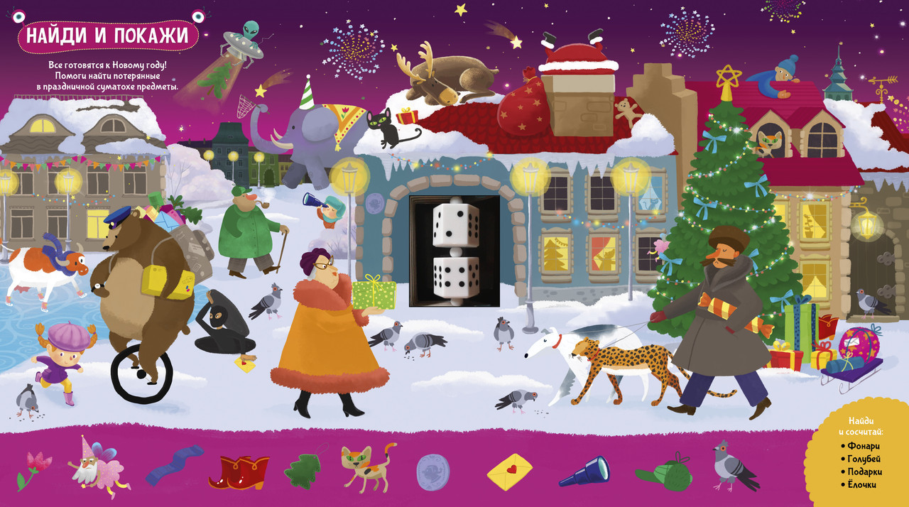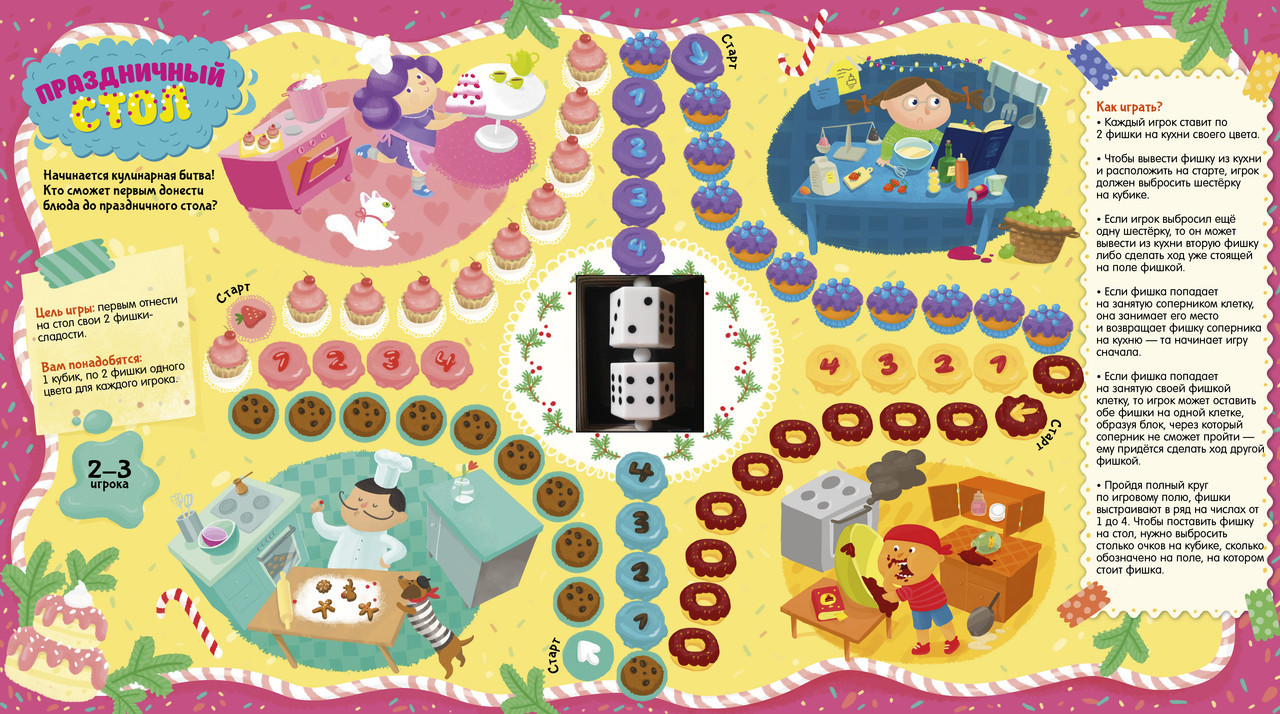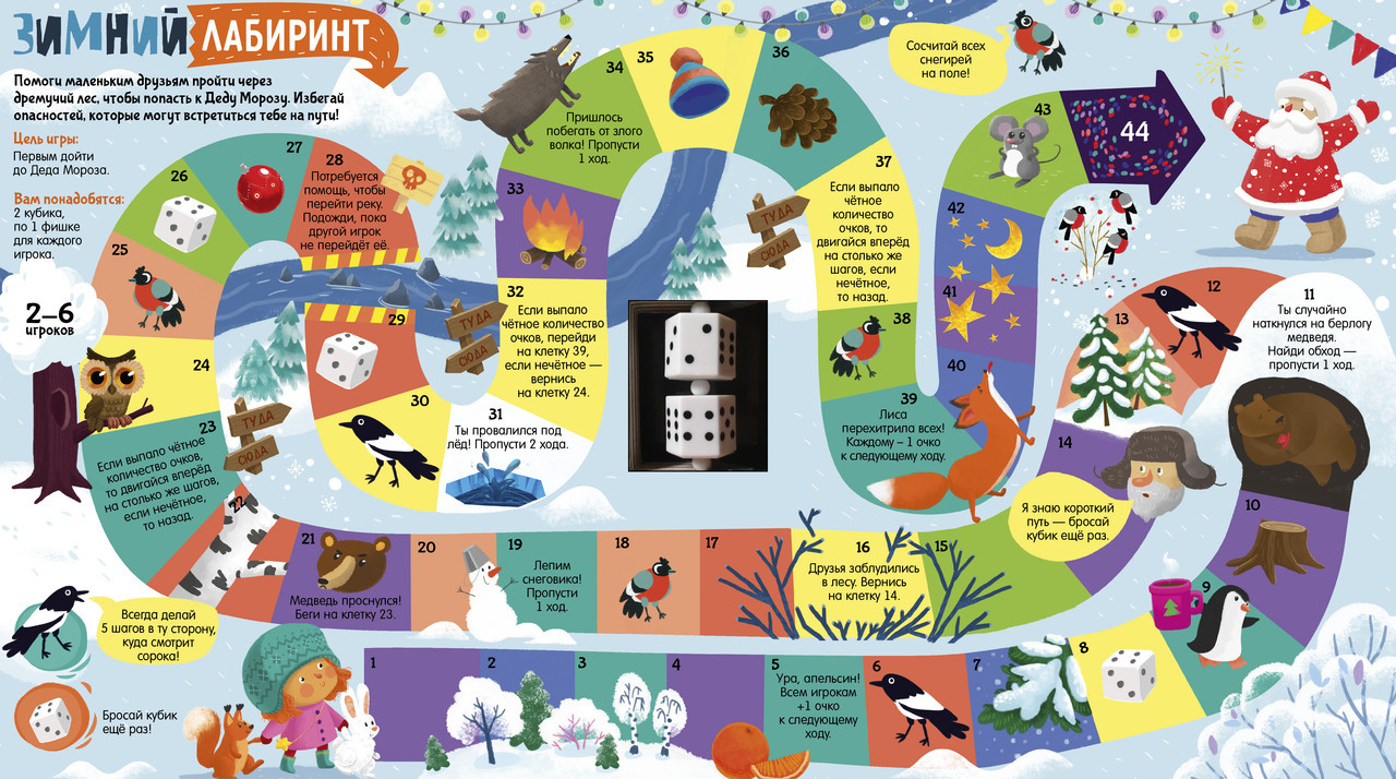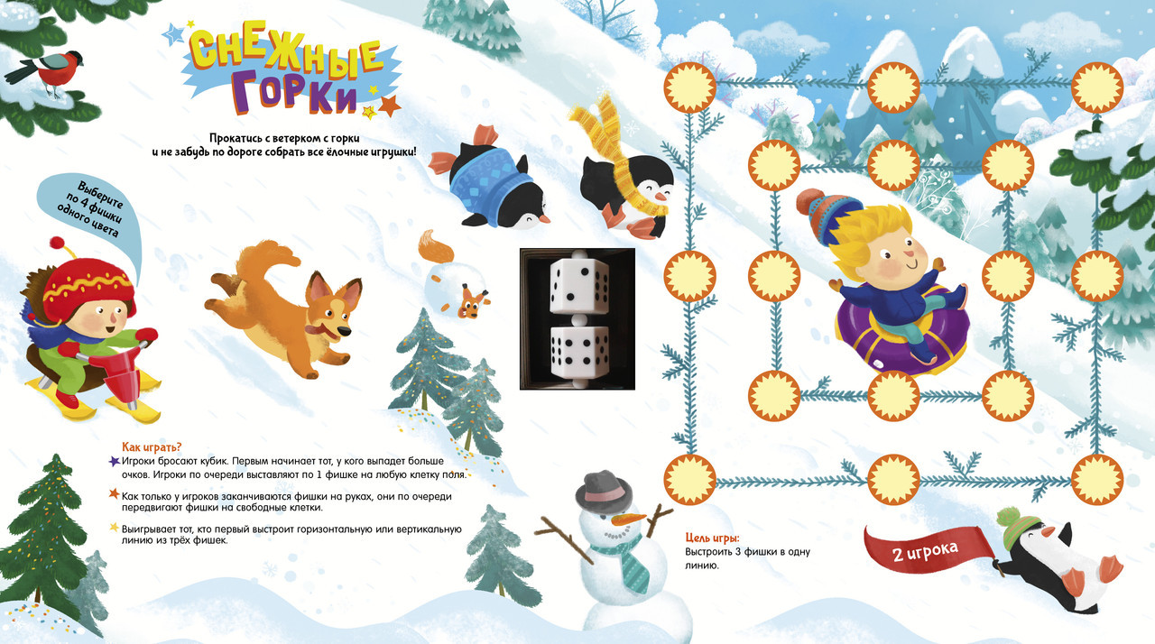 Настольные игры на разную тему и заинтересуют любого ребенка: «Снежные горки», «Зимний лабиринт», «Царь горы», «Найди и покажи», «Праздничный стол». «Большая книга новогодних игр» — это ходилки и бродилки для детей 6, 7, 8, 9 лет, это яркие иллюстрации и смешные задания для развития логического мышления, внимания, памяти, моторики. На каждом развороте вы найдете новую игру в картинках, которая понравится семьям с детьми, подойдет как для двух игроков, так и для большой компании друзей, любителей активити, квестов и настольных игр. Кубик и фишки есть в книге, их удобно хранить и невозможно потерять.