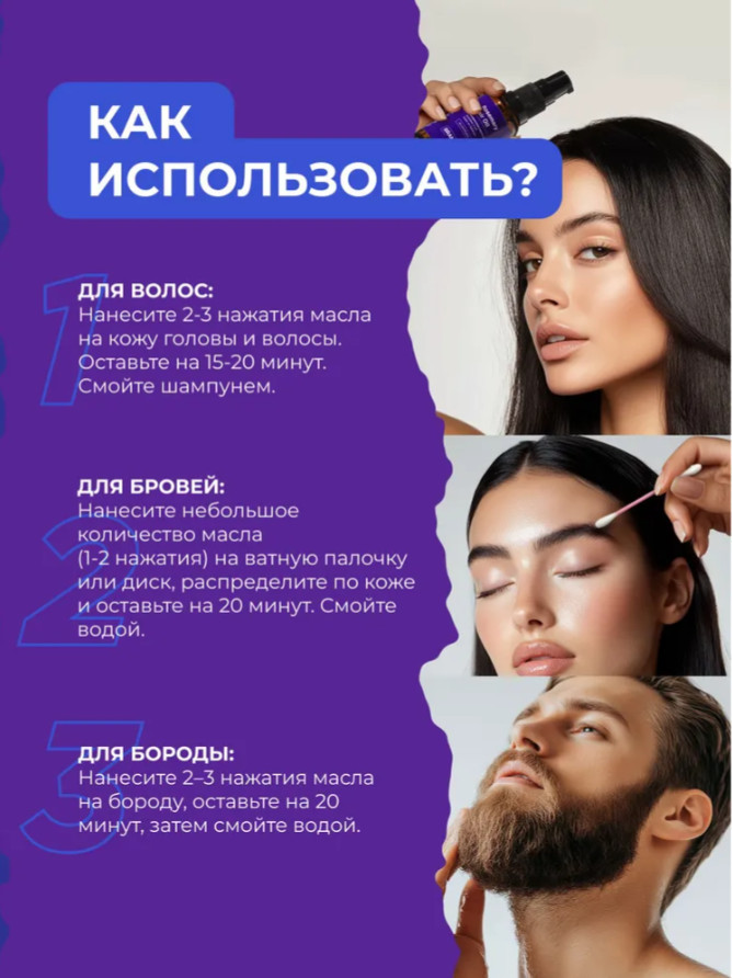 • для бороды: распределите масло, оставьте на 20 минут, затем смойте;