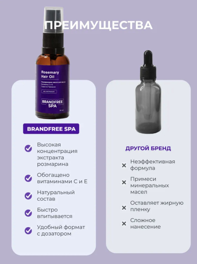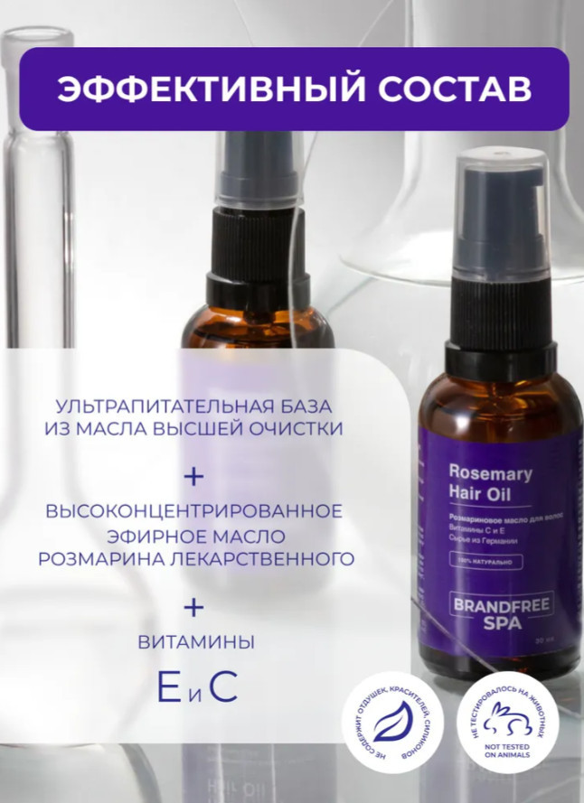 Масло розмарина для волос Brandfree Spa — это 100% натуральное масло для волос, бровей и бороды. 100% натуральное средство Brandfree Spa подходит для всех типов кожи головы (для сухой, нормальной и проблемной) и активно используется для роста волос, укрепления и защиты от повреждений.