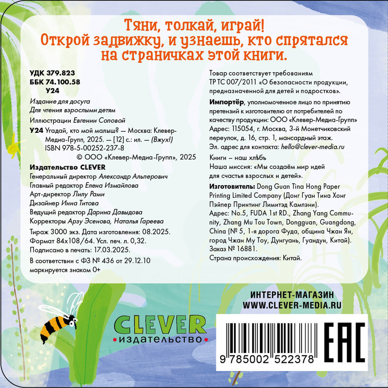 💳 Оплатить за товар можно при получении 🇰🇿 Есть бесплатная доставка по Казахстану 🎁 Копите бонусы с каждой покупки Серия: Вжух! Книжка-игрушка «Угадай, кто мой малыш?» — отличный способ изучить вместе с малышом новые слова и развить мелкую моторику. Она понравится детям, которые любят игру «ку-ку, кто там?». У этого малыша — пятнышки, а у этого — кисточка на хвосте. Кто же они? Открывайте задвижкм и знакомьтесь со зверятами, которые спрятались на страницах этой clever книги. |