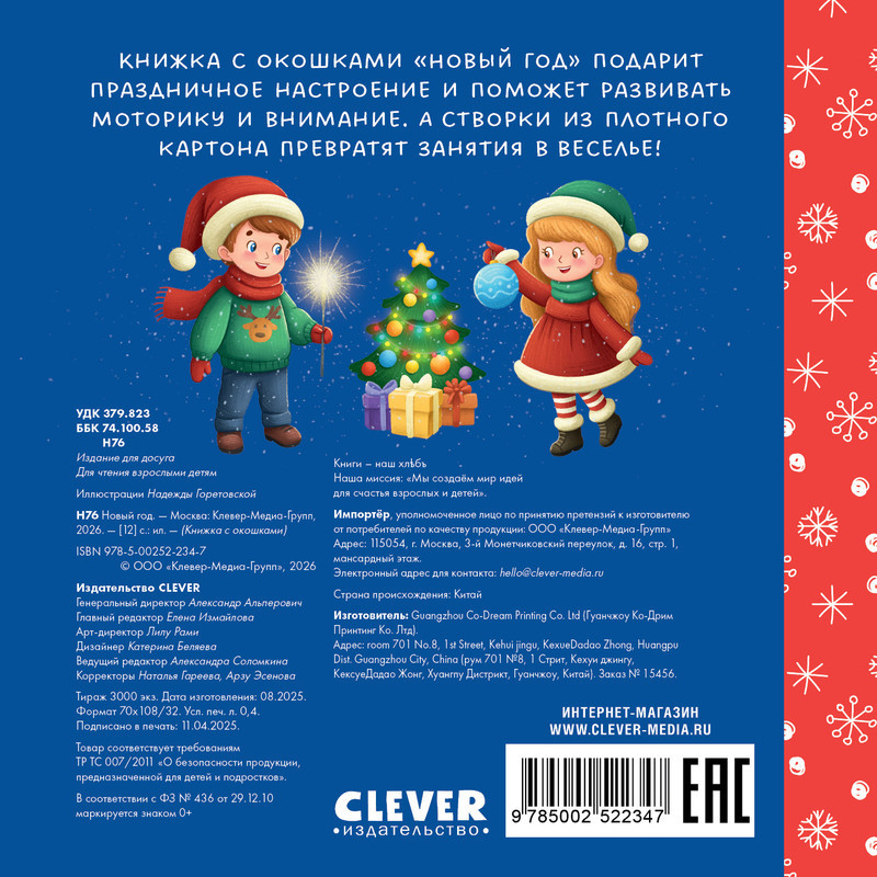 Плотный картон книжки для малышей 0–1, пять прочных картонных окошек, красивые иллюстрации, безопасные закругленные краешки — все это книжка с окошками «Новый год»! Пусть это будет незабываемый новогодний подарок для детей, как и другие Clever книги, новогодние книги, которые выпускает издательство Clever, детские сказки и детские книги для малышей про волшебство и чудеса.