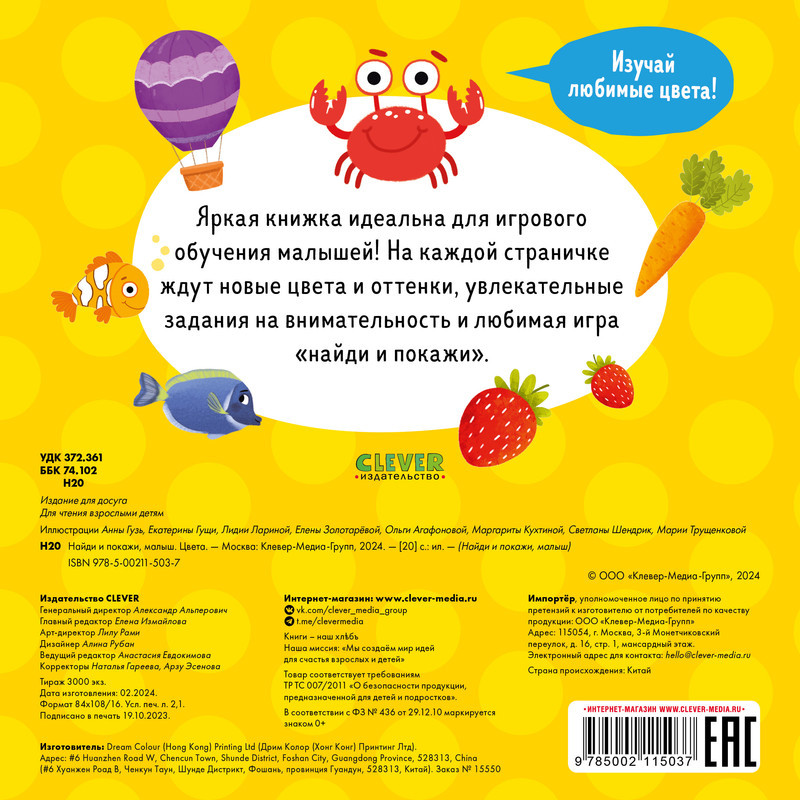 💳 Оплатить за товар можно при получении 🇰🇿 Есть бесплатная доставка по Казахстану 🎁 Копите бонусы с каждой покупки Яркая книжка идеальна для игрового обучения малышей! На каждой страничке из плотного картона ждут новые цвета и оттенки, увлекательные задания на внимательность и любимая игра «найди и покажи». |