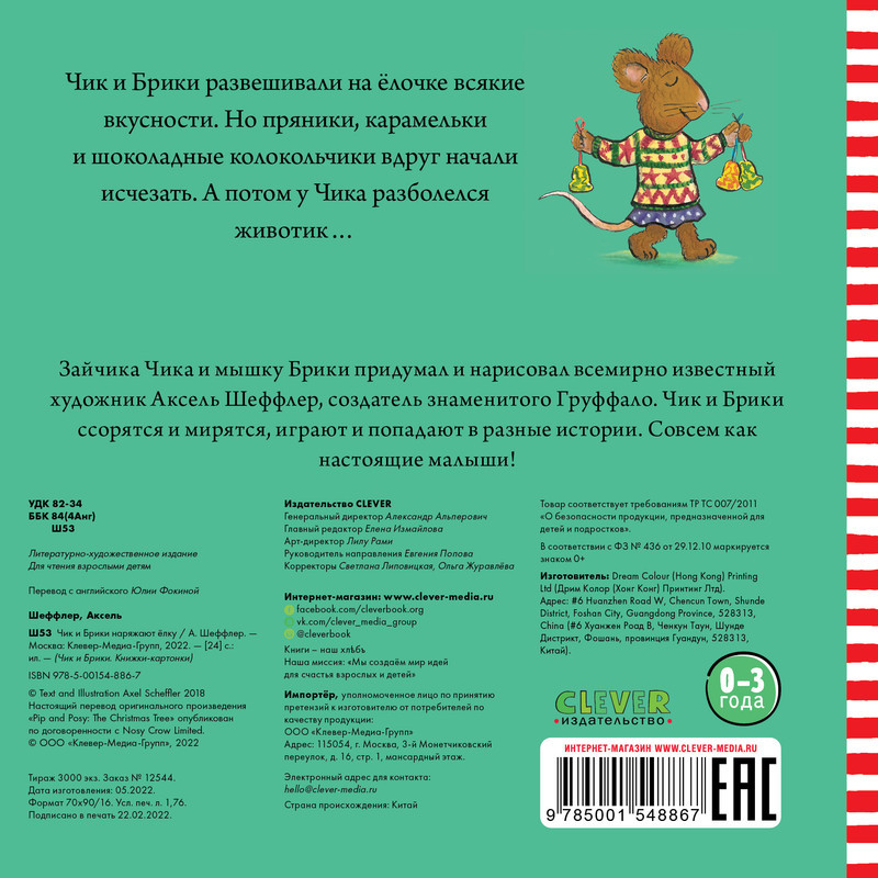 💳 Оплатить за товар можно при получении 🇰🇿 Есть бесплатная доставка по Казахстану 🎁 Копите бонусы с каждой покупки Это веселая история о том, как любимые герои малышей готовились к Новому году. Как и все книги этой серии, эта добрая сказка идеально подойдет для самого первого чтения и положит начало любви к чтению книг. Что нужно для Нового года? Конечно, елка, ну а к елочке нужны игрушки! Друзья Чик и Брики приготовили вкусные украшения: ароматные пряники, полосатые карамельки и шоколадные колокольчики. Но как только Брики отправилась за звездочкой для макушки, с елки начали пропадать игрушки! Куда пропали игрушки и как Чик и Брики встретили Новый год, читайте в этой веселой истории. Книжка-картонка «Чик и Брики наряжают елку» сделана специально для самых маленьких читателей. Прочный картон выдержит даже самый активный детский интерес, а закругленные уголки не поранят малыша. |