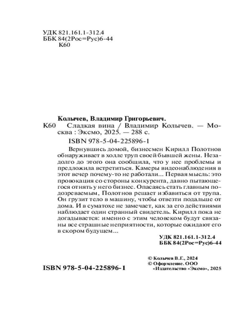 💳 Оплатить за товар можно при получении 🇰🇿 Есть бесплатная доставка по Казахстану от 1 дня 🎁 Копите бонусы с каждой покупки Серия: Колычев. Роковой соблазн (обложка) Вернувшись домой, бизнесмен Кирилл Полотнов обнаруживает в холле труп своей бывшей жены. Незадолго до этого она сообщила, что у нее проблемы, и предложила встретиться. Камеры видеонаблюдения в этот вечер почему-то не работали... Первая мысль: это провокация со стороны конкурента, давно пытающегося отнять у него бизнес. Опасаясь стать главным подозреваемым, Полотнов решает избавиться от трупа. Он грузит тело в машину, чтобы отвезти подальше от дома. И в суматохе не замечает, как за его действиями наблюдает один странный свидетель. Кирилл пока не догадывается: именно с этим человеком будут связаны все страшные неприятности, которые ожидают его в скором будущем... |