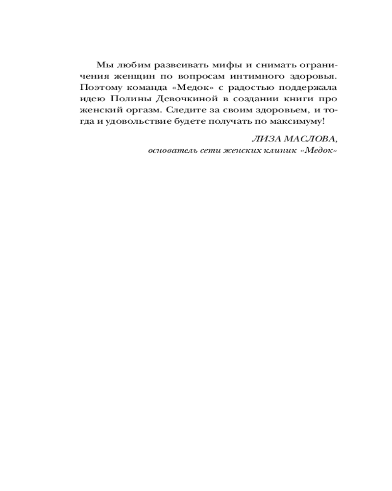 💳 Оплатить за товар можно при получении 🇰🇿 Есть бесплатная доставка по Казахстану от 1 дня 🎁 Копите бонусы с каждой покупки Серия: Плюс один здоровый человек. Книги о медицине от ведущих экспертов Оргазм — это рефлекс организма. Приятная реакция тела на определенные стимуляции, которые выполнены в нужном психологическом состоянии, в подходящей конкретной женщине технике. Соответственно, в теории, для достижения оргазма нужно всего лишь выполнить ряд условий. Но если всё так просто, то почему не все женщины его испытывают? Практикующий сексолог-психолог Полина Девочкина уверена, что ее книга принесет намного больше пользы, чем десяток индивидуальных консультаций. Потому что первые встречи с сексологом больше напоминают занятие с репетитором по анатомии, который разжевывает, что и как работает в механизме сексуальности — только после этого можно говорить о формировании какого-либо индивидуального подхода. Перед вами простой и понятный ликбез о женском оргазме, который включает в себя не только теорию, но и полезные тесты, практики и игры с вашим партнером. |
