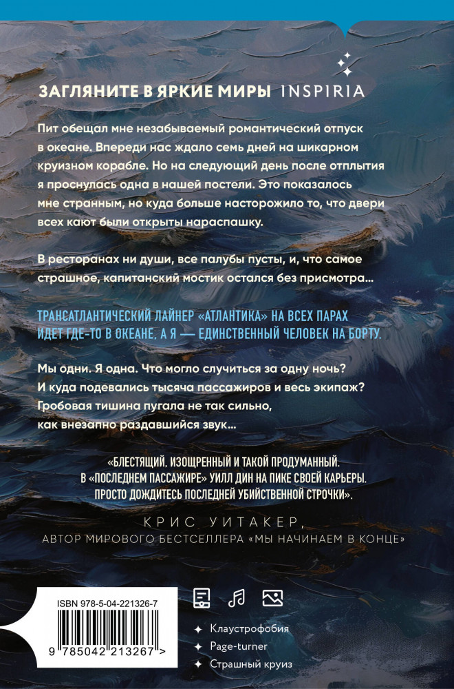 Пит обещал мне незабываемый романтический отпуск в океане. Впереди нас ждало семь дней на шикарном круизном корабле. Но на следующий день после отплытия я проснулась одна в нашей постели. Это показалось мне странным, но куда больше насторожило то, что двери всех кают были открыты нараспашку. В ресторанах ни души, все палубы пусты, и, что самое страшное, капитанский мостик остался без присмотра... Трансатлантический лайнер «Атлантика» на всех парах идет где-то в океане, а я — единственный человек на борту. Мы одни. Я одна. Что могло случится за эту ночь? И куда подевалась тысяча пассажиров и весь экипаж? Гробовая тишина пугала не так сильно, как внезапно раздавшийся звук... |