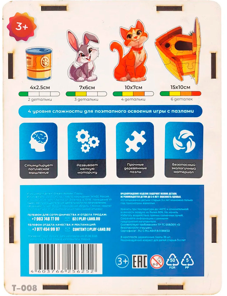 Dream Woods Пазл деревянный 11 в 1 «Домашние животные»+97
