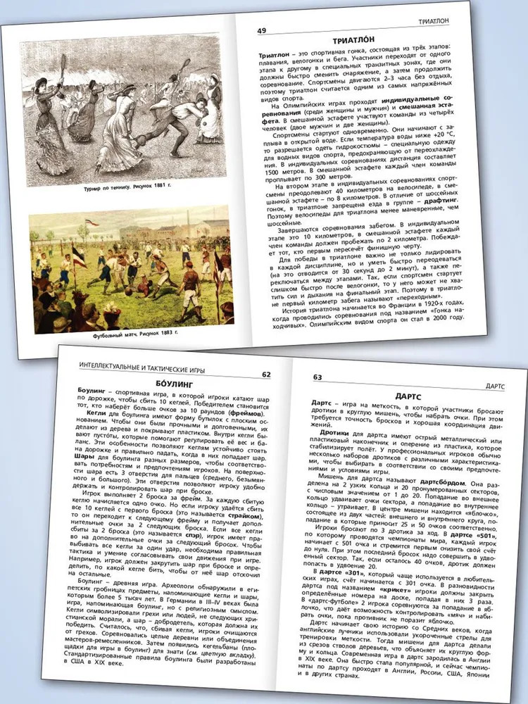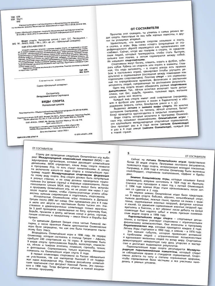 💳 Оплатить за товар можно при получении 🇰🇿 Есть бесплатная доставка по Казахстану от 1 дня 🎁 Копите бонусы с каждой покупки Серия: Школьный словарик Словарик знакомит читателя с разными видами спорта, их правилами и историей. В первом разделе описаны основные зимние и летние олимпийские виды спорта, во втором — распространённые неолимпийские виды. Среди неолимпийских выделены традиционные и популярные в разных странах виды спорта (боулинг, бильярд), экстремальные (рафтинг, альпинизм), интеллектуальные и технические (шахматы, дельтапланеризм), необычные (гонки на лодках-драконах, кабадди). Это деление условно, так как некоторые виды спорта являются одновременно интеллектуальными, техническими и экстремальными. Особое внимание уделено видам спорта разных народов России. Издание поможет школьникам расширить свой кругозор, подготовить сообщения о различных видах спорта. Адресовано младшим школьникам и их родителям. Поможет учителям и учащимся в подготовке к урокам. |