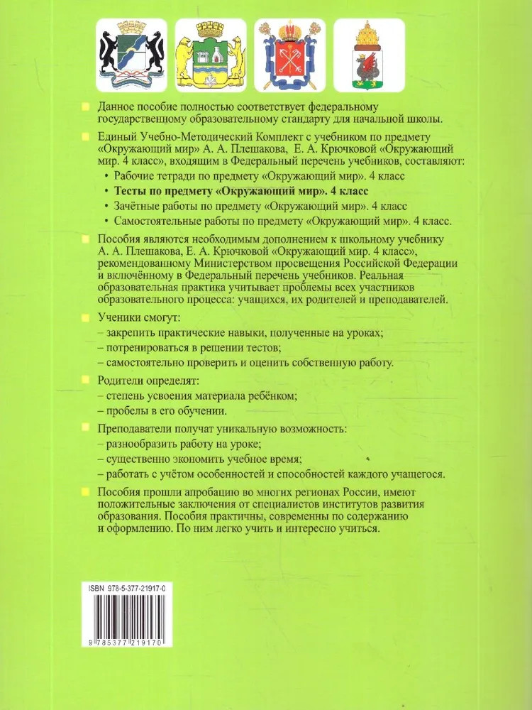 💳 Оплатить за товар можно при получении 🇰🇿 Есть бесплатная доставка по Казахстану 🎁 Копите бонусы с каждой покупки Настоящее пособие полностью соответствует федеральному государственному образовательному стандарту для начальной школы. В предлагаемом пособии представлены тесты по всем темам учебного комплекта А. А. Плешакова, Е. А. Крючковой «Окружающий мир. 4 класс. В 2-х частях». Этот материал также может быть использован учителями, работающими по-другому по учебникам. |