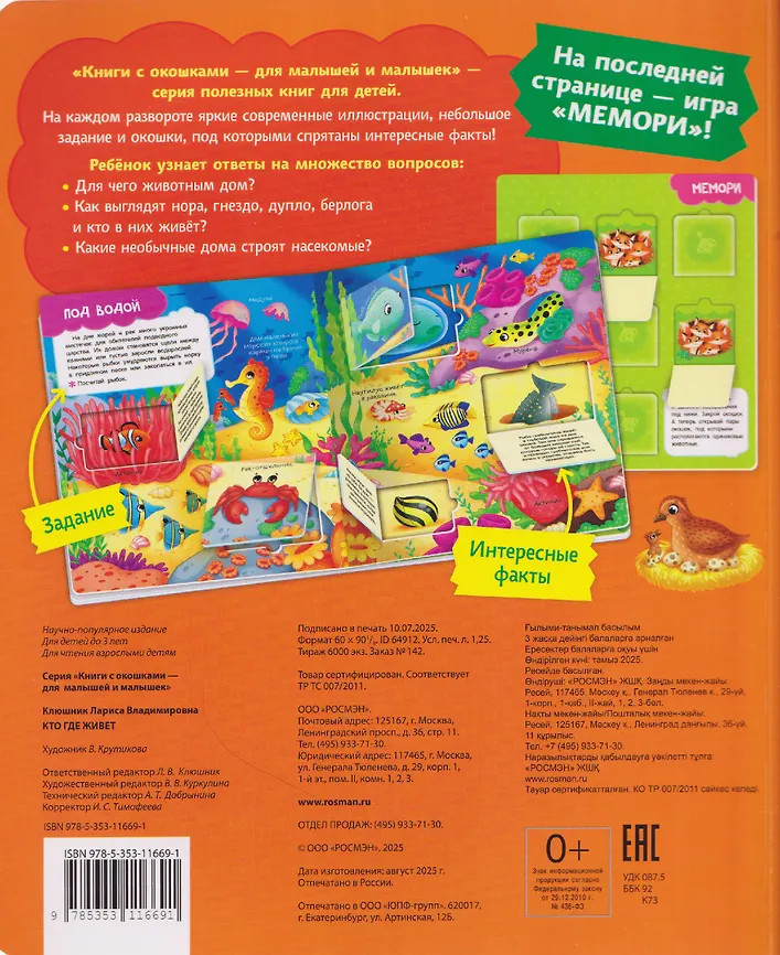 💳 Оплатить за товар можно при получении 🇰🇿 Есть бесплатная доставка по Казахстану 🎁 Копите бонусы с каждой покупки Серия: Книги с окошками «Книги с окошками для малышей и малышек» — серия полезных книг для детей. На каждом развороте яркие современные иллюстрации, небольшое задание и окошки, и окошки, открыв которые ребёнок узнает много интересного! Акцентируйте внимание ребенка на выделенных словах — так малышу будет проще расширить словарный запас и познакомиться с окружающим его миром. Из этой книжки малыш узнает, где живут различные животные, как называются места их обитания. |