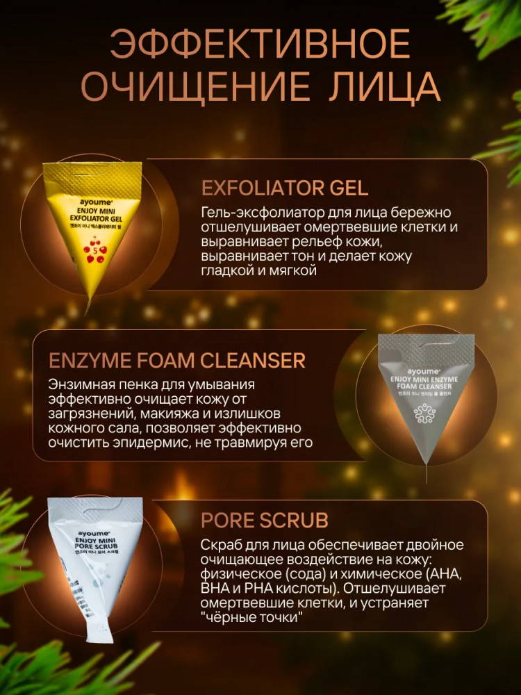 Ayome Enjoy Mini Enzyme Foam Cleanser: water, stearic acid, glycerin, lauric acid, potassium hydroxide, myristic acid, glycol distearate, PEG-100 stearate, glyceryl stearate, sorbitan sesquioleate, beeswax, cocamidopropyl betaine, fragrance, glyceryl caprylate, sodium chloride, allantoin, salicylic acid, betaine, disodium EDTA, butylene glycol, 1,2-hexanediol, citric acid, protease, sodium hyaluronate.