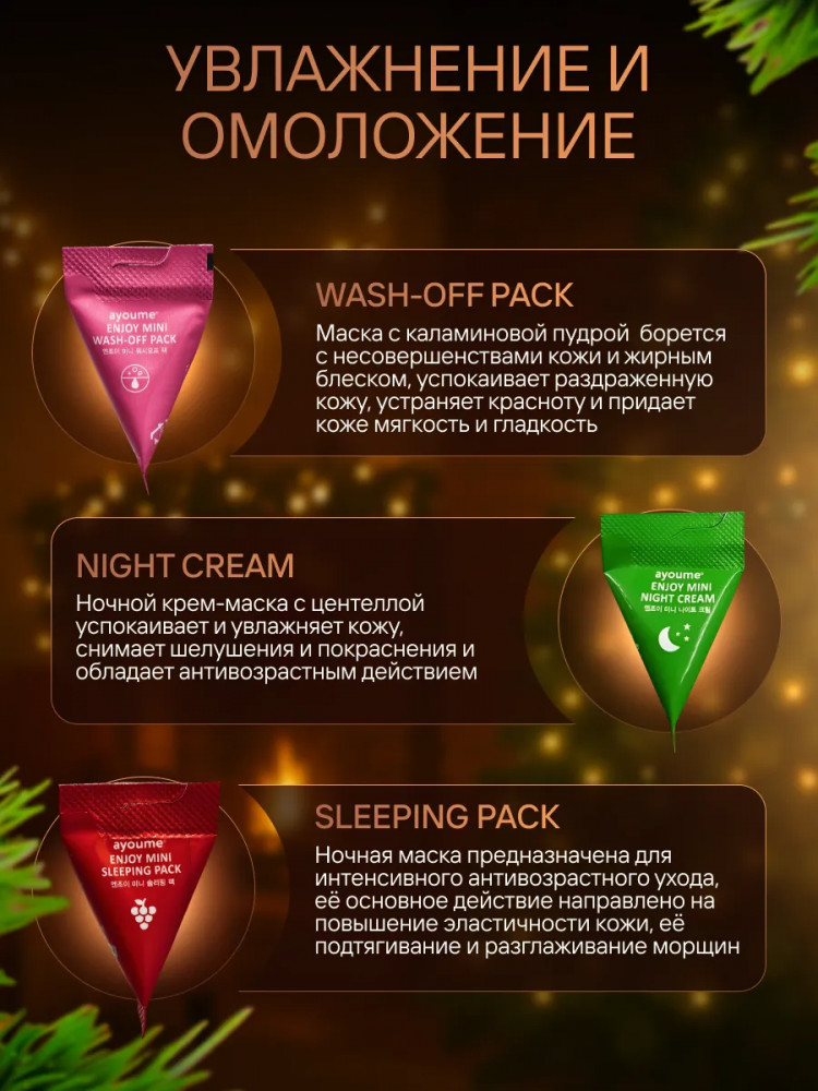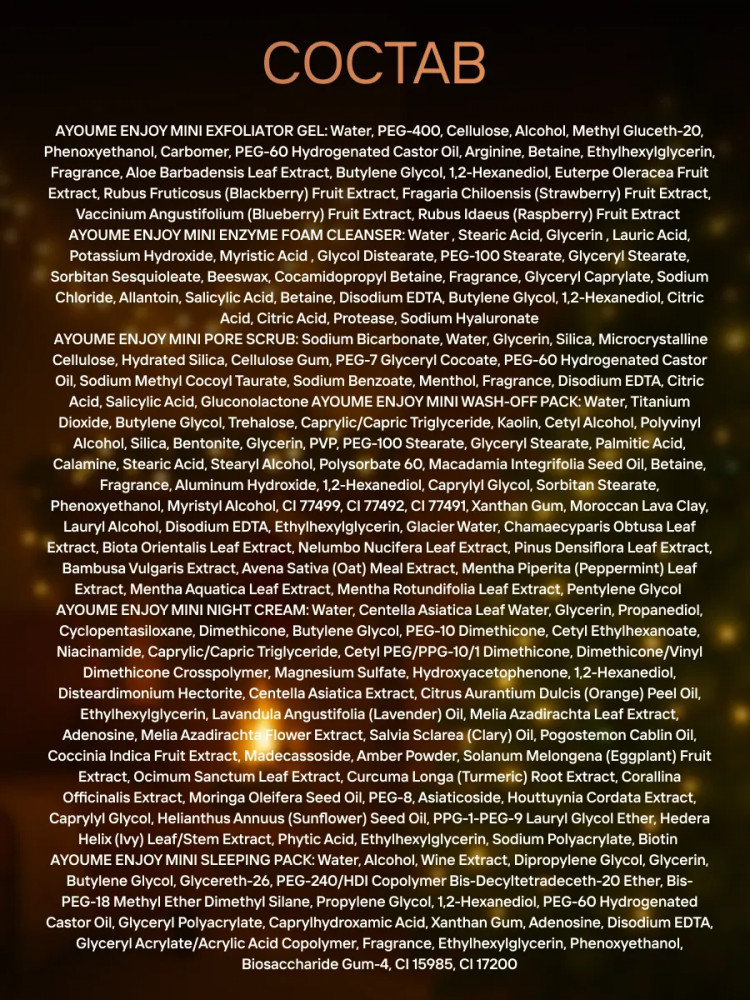 Ayome Enjoy Mini Night Cream: water, centella asiatica leaf water, glycerin, propanediol, cyclopentasiloxane, dimethicone, butylene glycol, PEG-10 dimethicone, cetyl ethylhexanoate, niacinamide, caprylic/capric triglyceride, cetyl PEG/PPG-10/1 dimethicone, dimethicone/vinyl dimethicone crosspolymer, magnesium sulfate, hydroxyacetophenone, 1,2-hexanediol, disteardimonium hectorite, centella asiatica extract, citrus aurantium dulcis (orange) peel oil, ethylhexylglycerin, lavandula angustifolia (lavender) oil, melia azadirachta leaf extract, adenosine, melia azadirachta flower extract, salvia sclarea (clary) oil, pogostemon cablin oil, coccinia indica fruit extract, madecassoside, amber powder, solanum melongena (eggplant) fruit extract, ocimum sanctum leaf extract, curcuma longa (turmeric) root extract, corallina officinalis extract, moringa oleifera seed oil, PEG-8, asiaticoside, houttuynia cordata extract, caprylyl glycol, helianthus annuus (sunflower) seed oil, PPG-1-PEG-9 lauryl glycol ether, hedera helix (ivy) leaf/stem extract, phytic acid, ethylhexylglycerin, sodium polyacrylate, biotin.