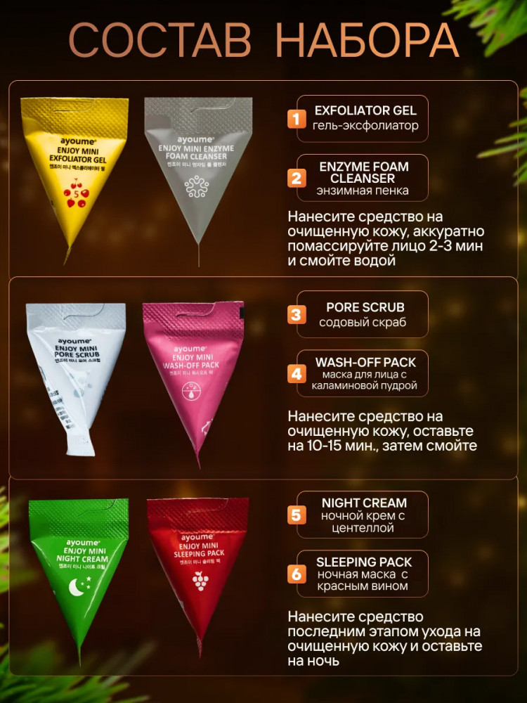 Ayome Enjoy Mini Sleeping Pack: water, alcohol, wine extract, dipropylene glycol, glycerin, butylene glycol, glycereth-26, PEG-240/HDI copolymer bis-decyltetradeceth-20 ether, bis-PEG-18 methyl ether dimethyl silane, propylene glycol, 1,2-hexanediol, PEG-60 hydrogenated castor oil, glyceryl polyacrylate, caprylhydroxamic acid, xanthan gum, adenosine, disodium EDTA, glyceryl acrylate/acrylic acid copolymer, fragrance, ethylhexylglycerin, phenoxyethanol, biosaccharide gum-4, CI 15985, CI 17200.
