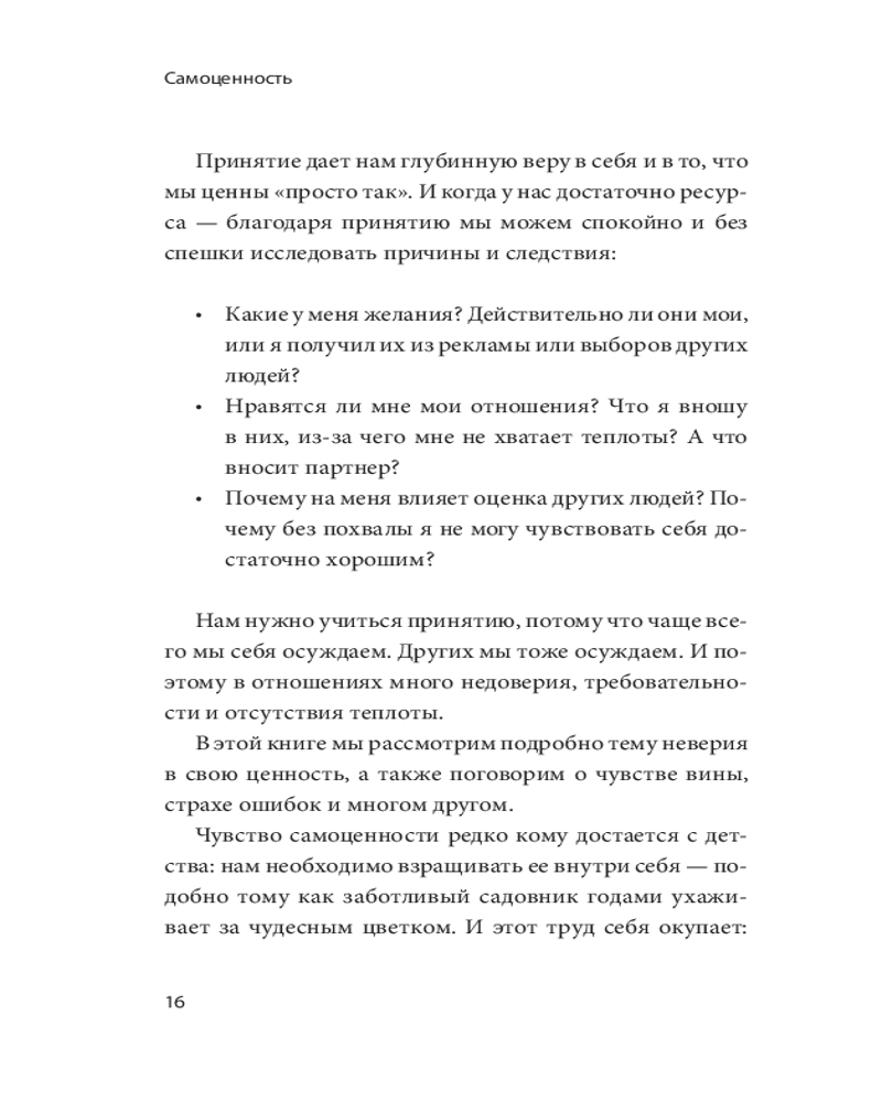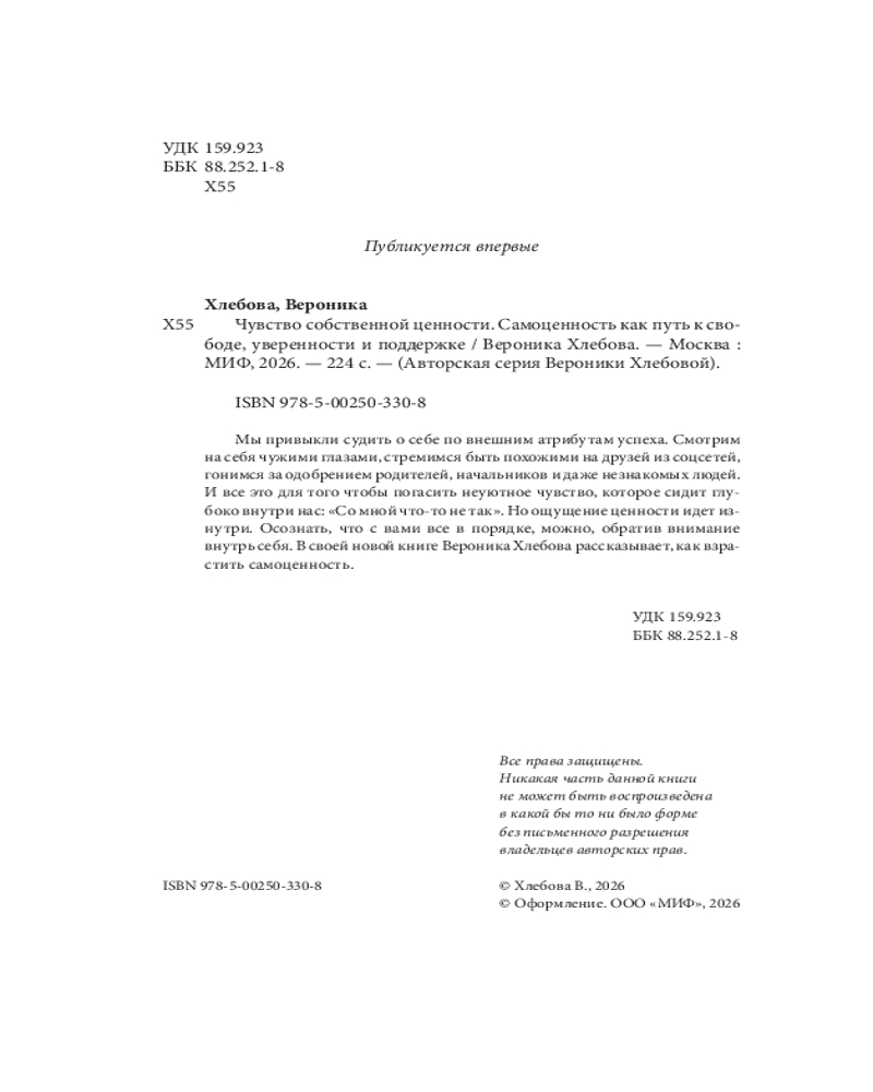 Серия: Авторская серия Вероники Хлебовой Новая книга Вероники Хлебовой — экзистенциального психолога с опытом работы более 15 лет и автора бестселлеров. Самоценность — это глубокое внутреннее ощущение своей значимости, независимое от внешних достижений. Мы привыкли судить о себе по внешним атрибутам успеха. Смотрим на себя чужими глазами, стремимся быть похожими на друзей из соцсетей, гонимся за одобрением родителей, начальников и даже незнакомых людей. И всё это для того, чтобы погасить неуютное чувство, которое сидит глубоко внутри нас: «Со мной что-то не так». |