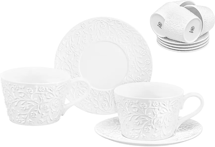 Набор 5 чайных пар из серии «Веточки-цветочки» от Elan Gallery предназначен для эстетичной сервировки вашего стола. Размер каждой ёмкости — 13,5×10×7 см, объём — 360 мл, размер каждого блюдца — 17,5×17,5×1,5 см. Выполнены из высококачественного белого фарфора. Он не впитывает цвет продуктов и легко отмывается, благодаря чему надолго сохранит свою белизну. Поверхность изделий овивают тонкие лиственные и цветочные веточки, возле которых порхают выразительные птицы. Кофейные кружки помогут провести множество приятных завтраков с вашим любимым кофе, а также уютные чайные вечера с конфетами, вафлями, другими десертами и сладостями. Подойдут ценителям чая и кофе, которые любят пить из красивой и необычной посуды. Согрейтесь зимой любимым горячим напитком: какао с маршмэллоу, ягодным чаем, горячим шоколадом. Летом освежитесь домашним лимонадом или морсом. Используйте сервировочные блюдца как подставки для чашек, чтобы порадовать гостей изящной сервировкой. Положите на десертные тарелки пирожные, кусочки торта или домашнего пирога. Подойдут не только для десертов, но и для закусок: сырной нарезки, сырокопчёной колбасы или свежих овощей и зелени. Декоративные изделия помогут провести уютное чаепитие в большой компании.