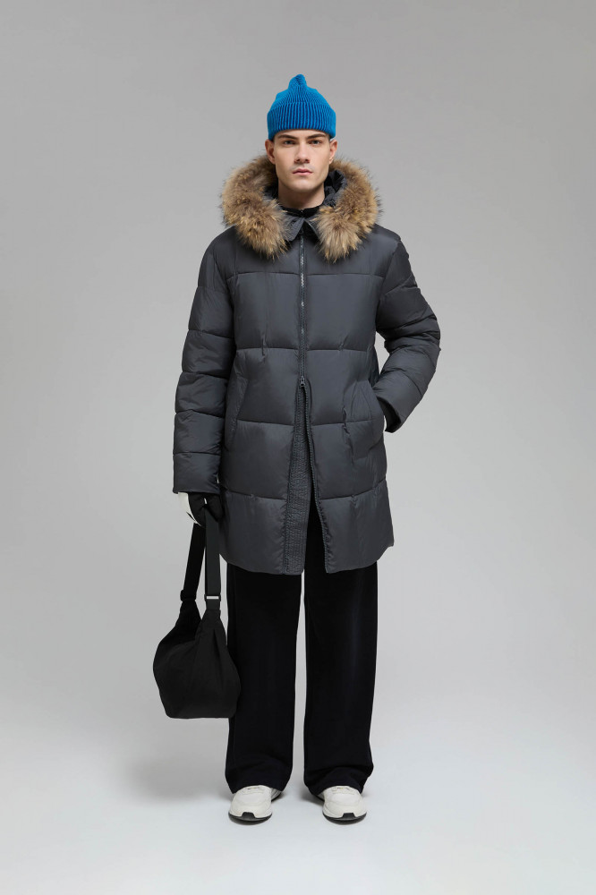 Стеганая куртка с капюшоном и съемной опушкой из натурального меха енота надежно защитит от морозов в холодное время года. Для удобства капюшон дополнен регулятором, внутри — скрытая кулиска на талии.