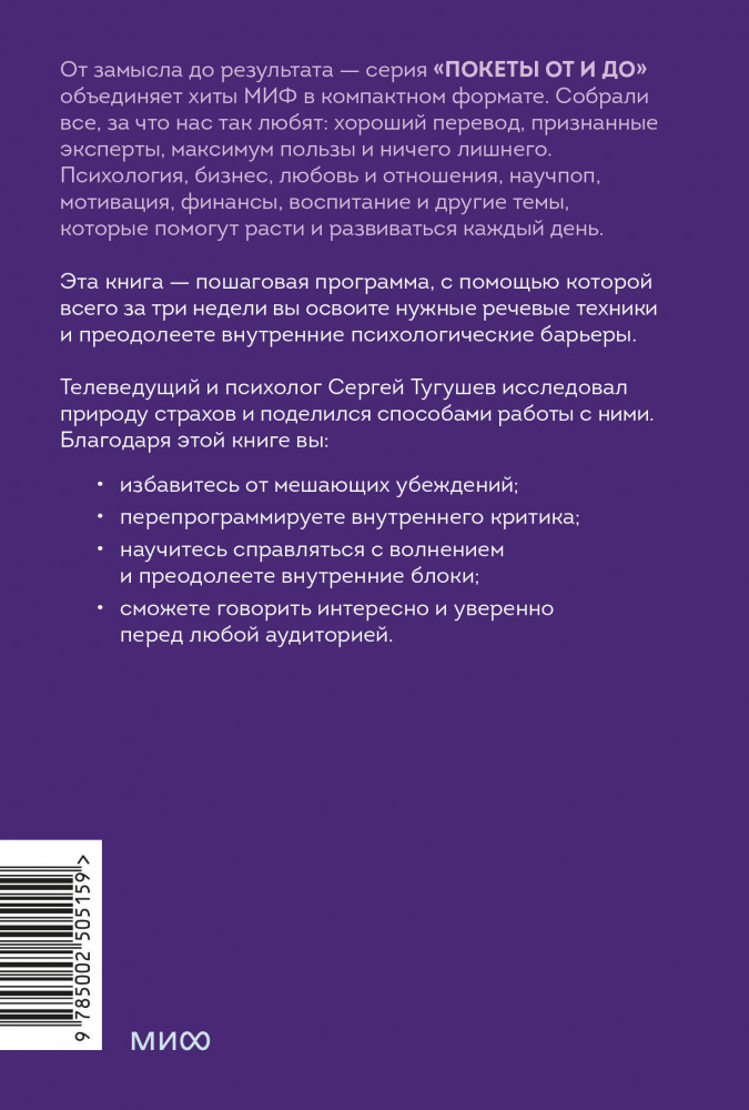💳 Оплатить за товар можно при получении 🇰🇿 Есть бесплатная доставка по Казахстану 🎁 Копите бонусы с каждой покупки Серия: Покеты. От и до Практически любой человек способен интересно выступать и говорить так, чтобы его слушали. Но для этого мало освоить техники совершенствования речи — необходимо проработать психологические ограничения. Именно из-за них мы не можем общаться с людьми, выходить в публичное поле и развиваться. |
