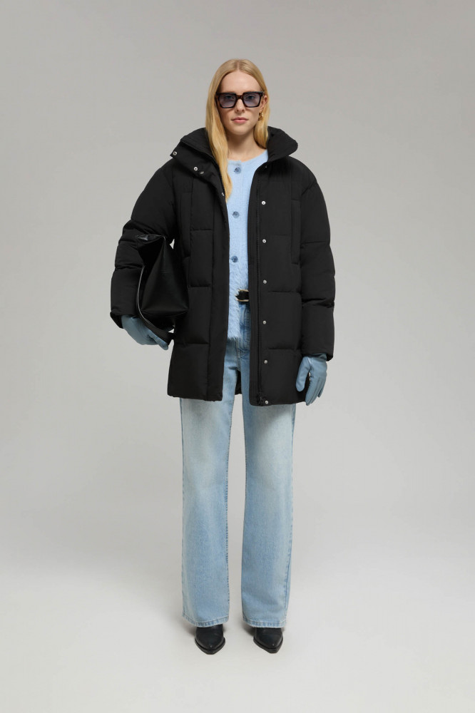 Благодаря свободному крою, под пуховик комфортно надевать объемные зимние свитеры и толстовки. Съемный капюшон с защитным козырьком, воротник-стойка и внутренние манжеты на рукавах служат дополнительной защитой от ветра. Застегивается на центральную молнию и ветрозащитную планку с кнопками.