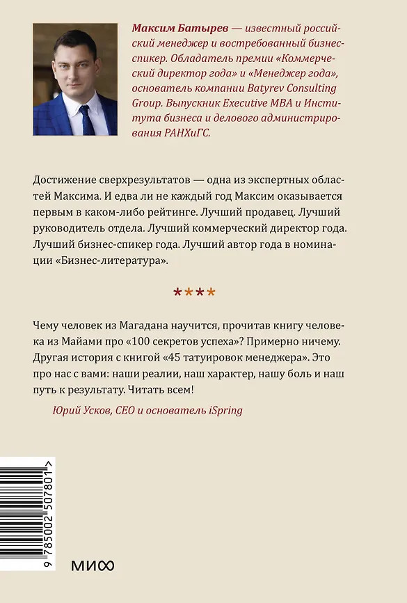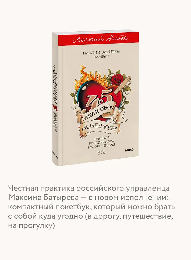 45 татуировок менеджера. Правила российского руководителяВ данный момент этот товар отсутствует в продаже. Возможно, у нас найдется аналогичный или похожий товар здесь. Серия: Легкий выбор Татуировка — это надпись на всю жизнь. Важная надпись. Названия глав в этой книге — татуировки, оставшиеся в памяти и сердце менеджера, его житейский и организаторский опыт. Это правила о том, как относиться к коллегам, каким образом действовать в определенных ситуациях: свод принципов, которым стоит следовать, если хочешь добиться успеха. Почему? Потому что за каждой главой стоят осмысленные действия, чья-то боль, мучения, радости, удачный и неудачный опыт, подъемы и падения, увольнения и лидерство, а главное — нужный результат. |