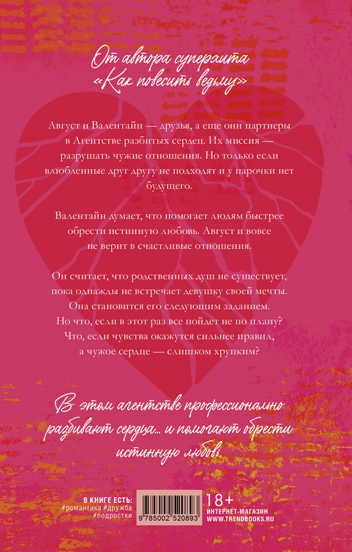 Август и Валентайн ― друзья, а еще создатели Агентства разбитых сердец. Их цель ― разрушать чужие отношения, если влюбленные друг другу не подходят и у них нет будущего. Валентайн уверена, что с ее помощью люди быстрее обретают настоящую любовь. Август же вовсе не верит в счастливые отношения, пока однажды не встречает девушку своей мечты. Она становится его следующим заданием. Но что, если в этот раз все пойдет не так, как планировалось? Что, если чувства перевесят правила, а чужое сердце окажется слишком хрупким?