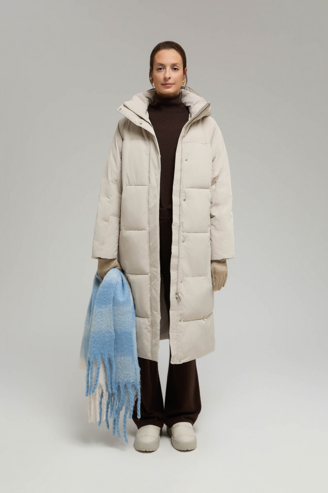 Стеганое пальто с капюшоном надежно защитит от морозов в холодное время года. Выполнено из мембранной ткани со специальными пропитками, которая защищает от мокрого снега, дождя и ветра, при этом пропускает воздух и позволяет телу дышать. Ткань устойчива к загрязнениям и отличается износостойкостью.