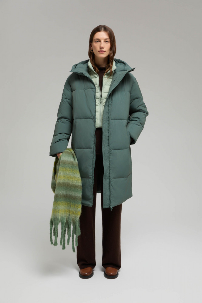 Легкий и прочный подклад обработан антибактериальной и полиуретановой пропитками, которые предотвращают развитие микрофлоры и продлевают срок службы изделия. Пальто свободного кроя комфортно садится по фигуре, не сковывая движения. Съемный капюшон дополнен внутренней утяжкой, с помощью которой удобно регулировать степень прилегания капюшона. Застегивается на центральную молнию.
