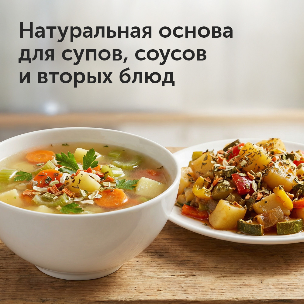 Очень понравились эти специи. В составе сушёный лук, морковь, петрушка, укроп и другие натуральные ингредиенты — без соли и лишних добавок. Ценю их именно за чистый состав: они мягко подчёркивают вкус блюд, делают его насыщенным, но не перебивают. Удобно использовать в повседневной кухне — подходят и к супам, и к овощам, и к мясу.