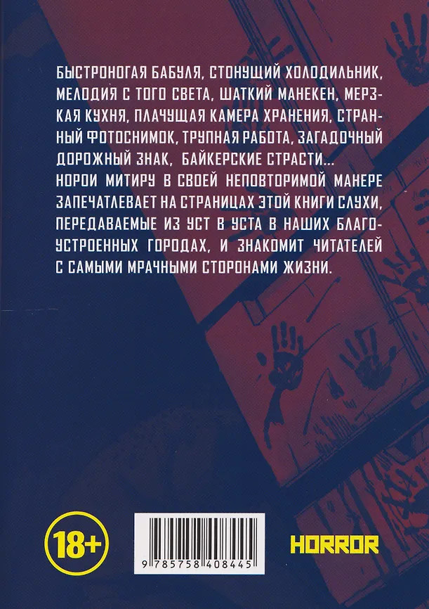 💳 Оплатить за товар можно при получении 🇰🇿 Есть бесплатная доставка по Казахстану от 1 дня 🎁 Копите бонусы с каждой покупки Быстроногая бабуля, стонущий холодильник, мелодия с того света, шаткий манекен, мерзкая кухня, плачущая камера хранения, странный фотоснимок, трупная работа, загадочный дорожный знак, байкерские страсти... Норои Митиру в своей неповторимой манере запечатлевает на страницах этой книги слухи, передаваемые из уст в уста в наших благоустроенных городах, и знакомит читателей с самыми мрачными сторонами жизни. |