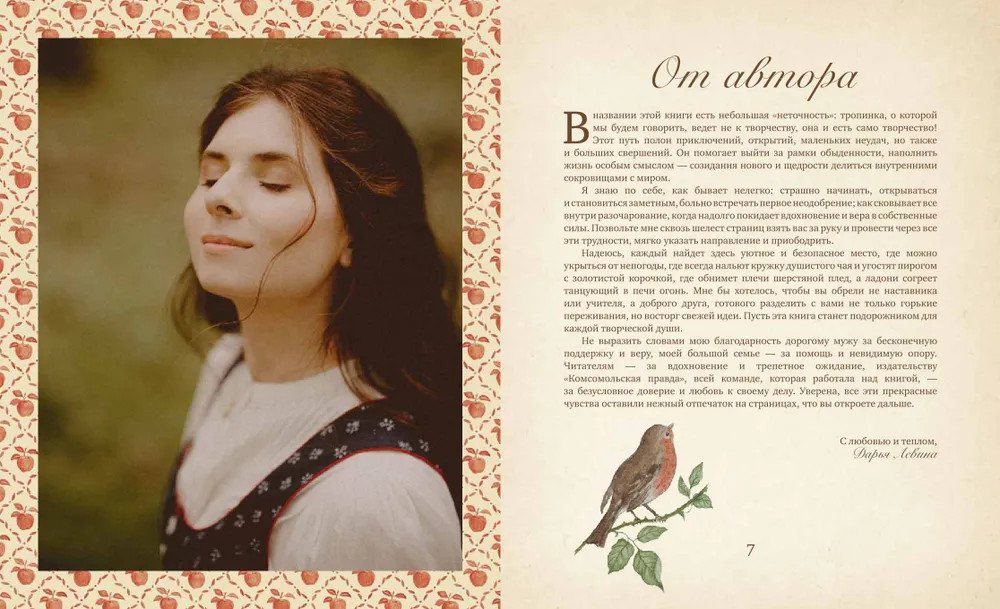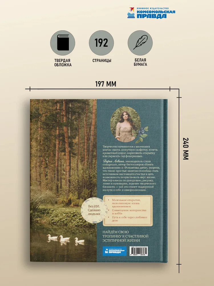 💳 Оплатить за товар можно при получении 🇰🇿 Есть бесплатная доставка по Казахстану 🎁 Копите бонусы с каждой покупки Серия: Быть Женщиной В новой книге Дарьи Левиной, законодательницы стиля cottagecore, автора бестселлеров «Книга вдохновения» и «Романтика дачи», собрано всё, что делает жизнь ярче: мастер-классы по лепке, рисованию, шитью и вышивке, идеи для украшения дома и сада и даже советы по ведению творческого блокнота. На примере собственного опыта Дарья показывает, что творчество может быть не только увлечением, но и внутренней опорой. Внутри вы найдете размышления о том, как искать вдохновение и развить талант, как справляться с критикой и творческими кризисами, как совмещать хобби с материнством и повседневными заботами. А маленькие творческие ритуалы помогут шаг за шагом обрести уверенность в себе. Отдельное удовольствие — любимые сезонные рецепты: пастушье рагу, крамбл с ревенем, тыквенный пирог, зимнее печенье и ещё много лакомств. «Тропинка к творчеству» вдохновит каждого пробовать новое и наполнять жизнь красотой. |