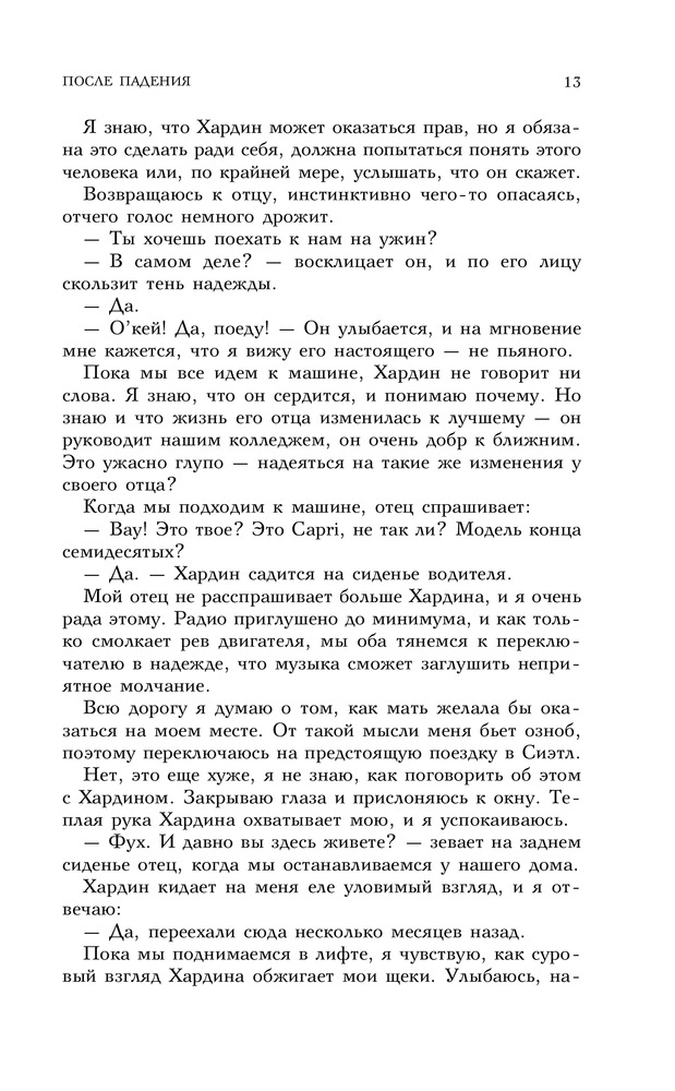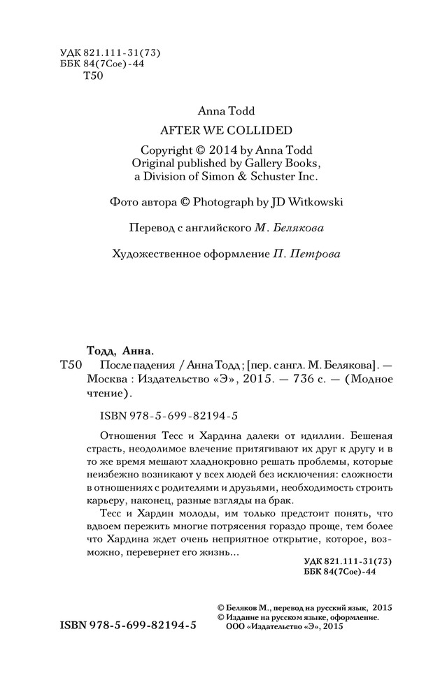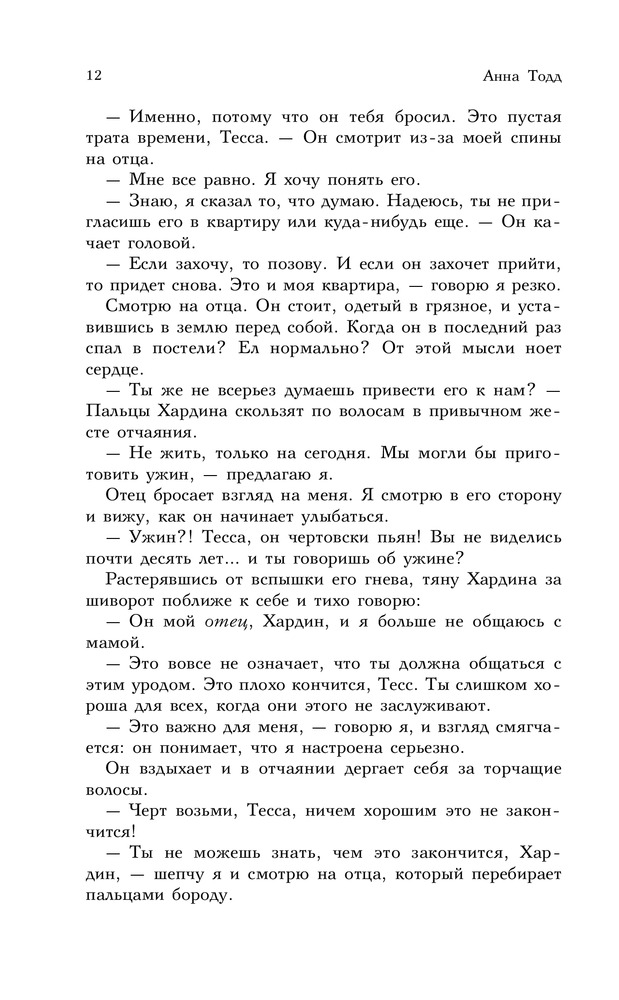 После паденияВ данный момент этот товар отсутствует в продаже. Возможно, у нас найдется аналогичный или похожий товар здесь. Серия: Модное чтение. Проза Анны Тодд Отношения Тесс и Хардина далеки от идиллии. Бешеная страсть, неодолимое влечение притягивают их друг к другу и в то же время мешают хладнокровно решать проблемы, которые неизбежно возникают у всех людей без исключения: сложности в отношениях с родителями и друзьями, необходимость строить карьеру, наконец, разные взгляды на брак. Тесс и Хардин молоды, им только предстоит понять, что вдвоем пережить многие потрясения гораздо проще, тем более что Хардина ждет очень неприятное открытие, которое, возможно, перевернет его жизнь... |