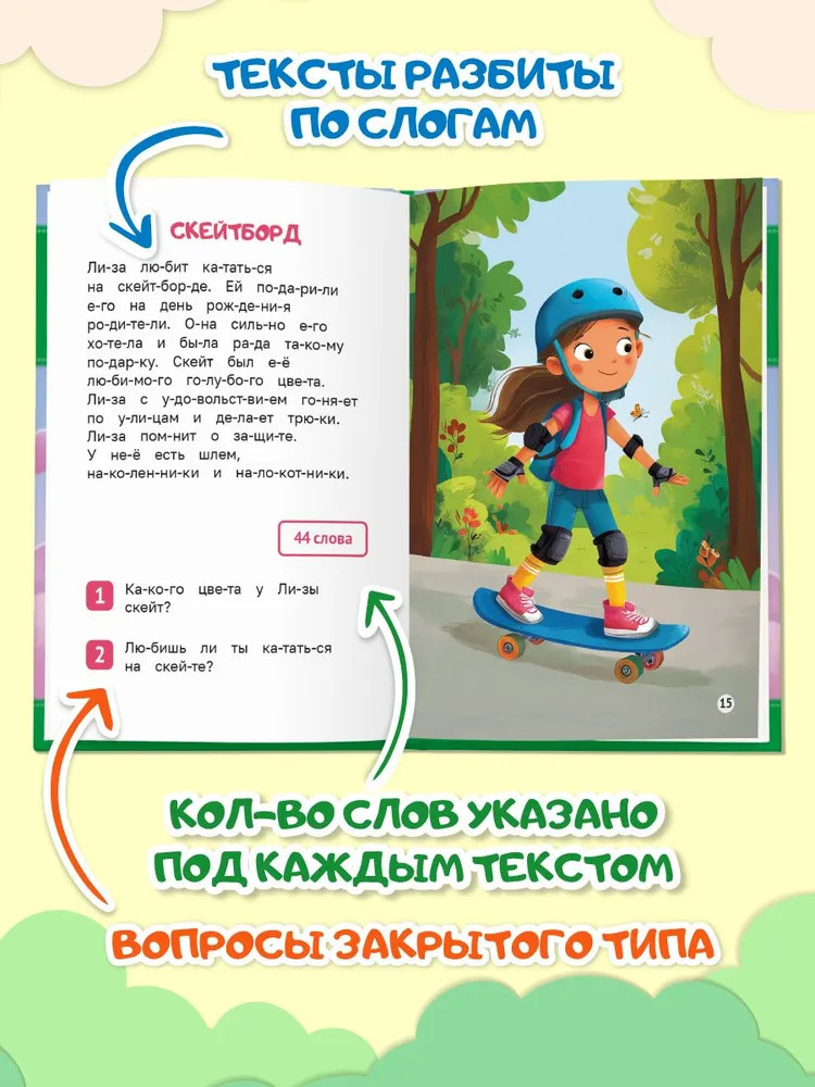 💳 Оплатить за товар можно при получении 🇰🇿 Есть бесплатная доставка по Казахстану 🎁 Копите бонусы с каждой покупки Серия: Читаем по слогам Серия «Читаем по слогам» — это дружелюбный проводник в мир чтения для детей 6–8 лет. Четыре уровня, крупный шрифт, живые иллюстрации и подсчёт слов на каждой странице помогут ребёнку уверенно шагать от слога к предложению. Книги станут отличным подарком в садик или подарком в школу, а также надёжной поддержкой в домашнем обучении чтению. |