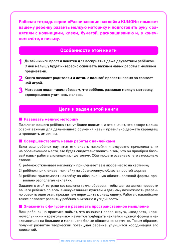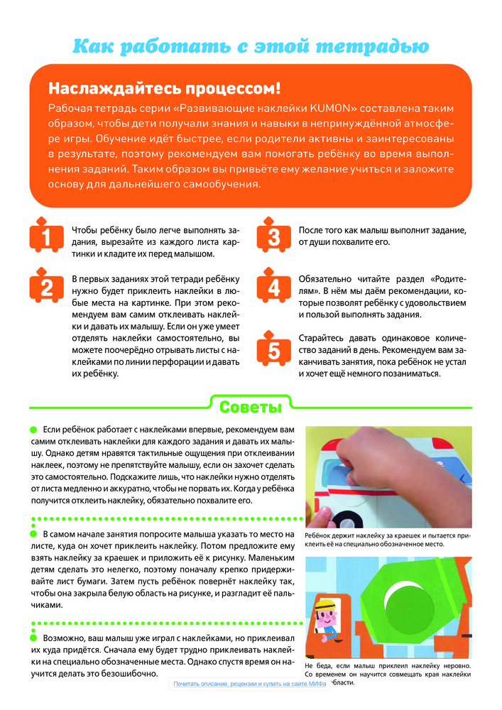 Очень хорошие наклейки, многоразовые. Прекрасно подойдет для деток, которые только знакомятся с наклейками и деткам, которые уже чуть-чуть с ними работали. Задания от простого к сложному. Сначала клей кула хочешь, потом заклей уже указанное место, потом заклей, чтоб довершить картинку. Все задания интересные. по завершению задания обсуждаем , запоминаем. здорово. Кстати, знакомство с kumon надо начинать именно с наклеек.