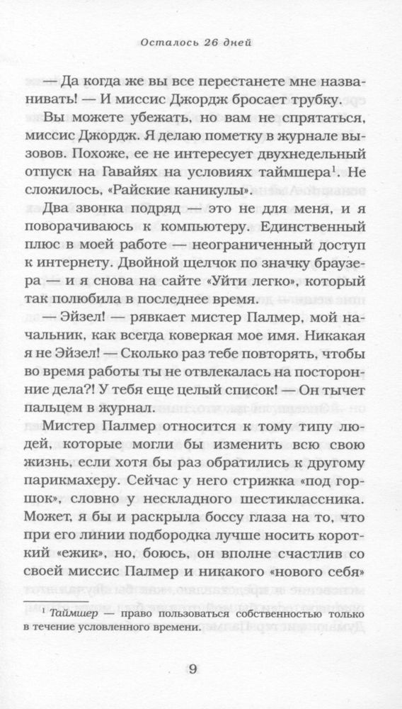Мое сердце и другие черные дырыВ данный момент этот товар отсутствует в продаже. Возможно, у нас найдется аналогичный или похожий товар здесь. Серия: Виноваты звезды Одиночество вынуждает шестнадцатилетнюю Айзел задуматься о самоубийстве. Но у нее самой не хватает смелости совершить этот шаг. На сайте «Уйти легко» она встречает юношу, который также принял решение расстаться с жизнью. Но чем больше времени они проводят вместе, обсуждая где и как наступит их конец, тем больше девушке хочется остаться в живых. Сумеет ли она уговорить и Романа выбрать жизнь, а не смерть. |