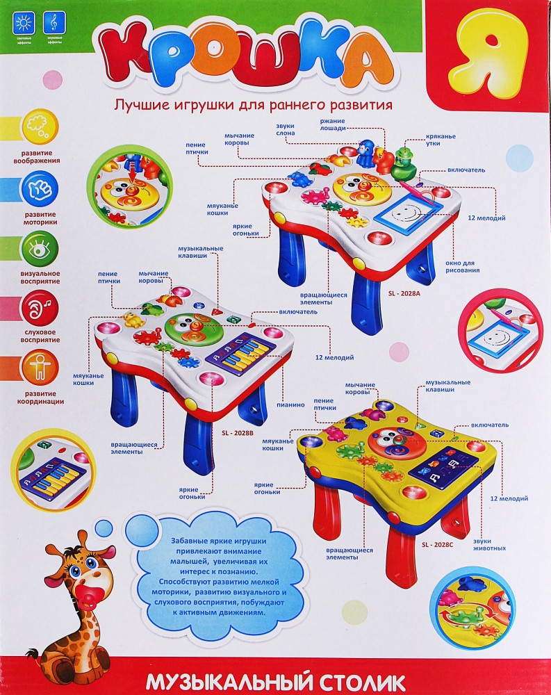 Крошка Я Музыкальный развивающий столикВ данный момент этот товар отсутствует в продаже. Возможно, у нас найдется аналогичный или похожий товар здесь. Столик развивающий музыкальный, световые эффекты, работает от батареек — забавная, яркая игрушка привлечет внимание Вашего малыша. С этой игрушкой малыш начнет познавать фигуры, изучать животных и цифры, развивать координацию и логическое мышление. Так же игрушка способствует развитию мелко моторики, визуального и слухового восприятия, побуждает к активным движениям. |