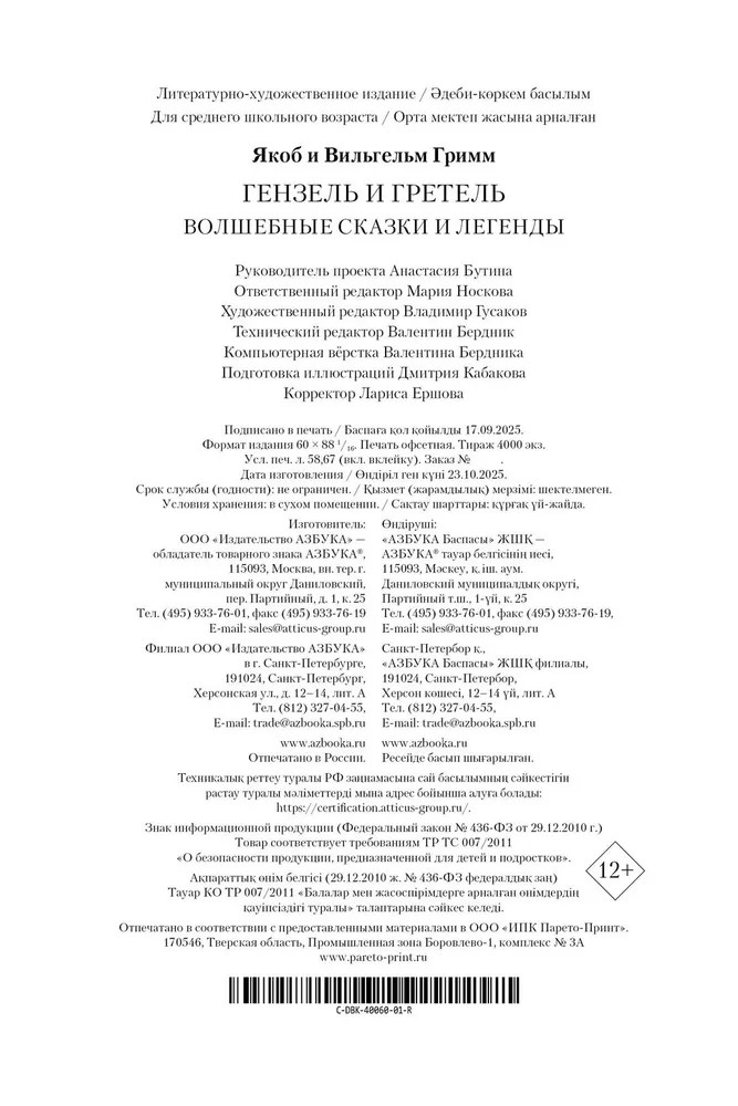 💳 Оплатить за товар можно при получении 🇰🇿 Есть бесплатная доставка по Казахстану 🎁 Копите бонусы с каждой покупки Серия: Детская библиотека. Большие книги По тропинке, усыпанной хлебными крошками, мы отправимся в мир сказок и легенд, таинственный и немного пугающий, как дремучий лес. У Гензеля и Гретель научимся не сдаваться в самых безвыходных ситуациях, с Бременскими музыкантами — ценить дружбу и взаимовыручку, у Храброго Портняжки наберемся смелости и находчивости, а с Белоснежкой убедимся, что доброта и чистое сердце всегда побеждают зло и коварство. Народные сказки и предания, передаваемые из уст в уста поколениями немцев, Якоб и Вильгельм Гримм собирали скрупулёзно и с любовью. Неслучайно их сборник «Детские и семейные сказки» включён в список всемирного документального наследия ЮНЕСКО «Память мира» как уникальный пример сохранения культурных традиций Германии. |
