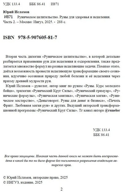 💳 Оплатить за товар можно при получении 🇰🇿 Есть бесплатная доставка по Казахстану 🎁 Копите бонусы с каждой покупки Вторая часть дилогии «Руническое целительство», в которой детально разбирается применение рун для исцеления и оздоровления, также предлагается множество формул на разные исцеляющие задачи. Помимо этого, даётся возможность провести исцеляющую трансформацию своего сознания, вдумчиво осознавая природу любой болезни и её исцеления через призму древней мудрости рун. |
