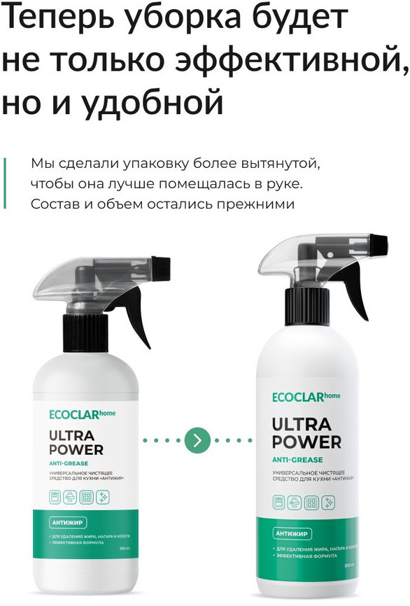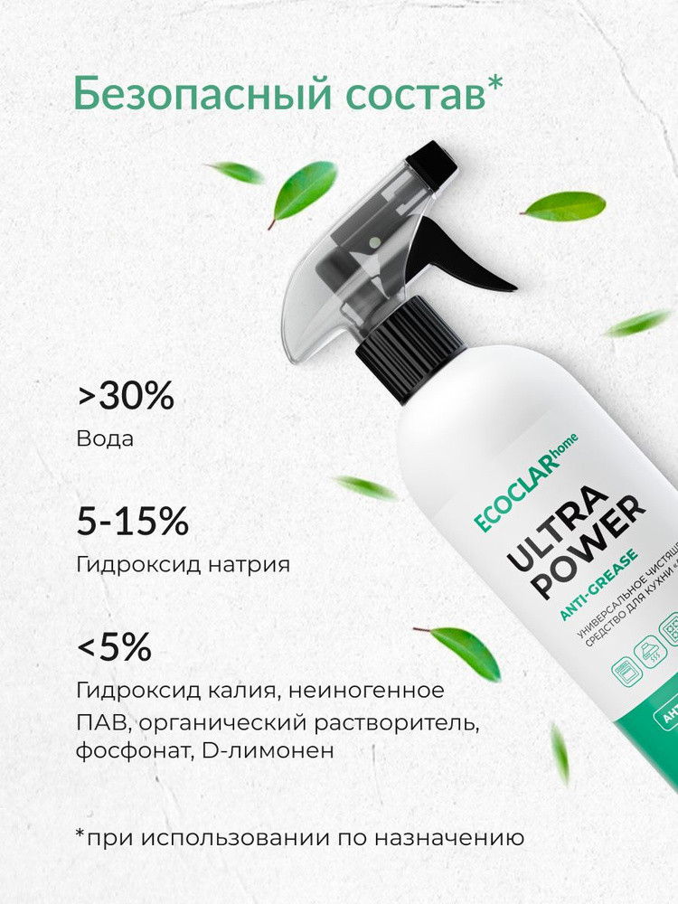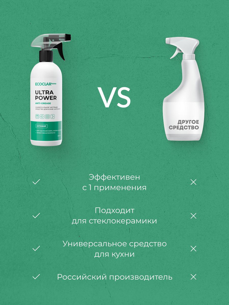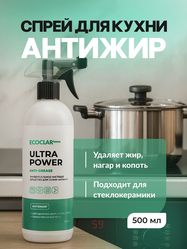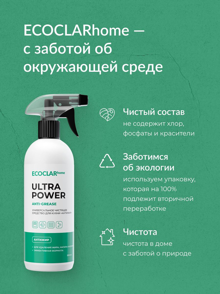 Как справиться с надоевшими загрязнениями, которые не смогло убрать ни одно средство? Попробуйте универсальное чистящее средство для кухни «Антижир» от ECOCLAR home. Спрей для кухни быстро и легко поможет удалить жир, нагар и копоть. Подходит для эмали, СВЧ, кухонных плит, коптильных камер, духовых шкафов, вытяжек, грилей, посуды и кухонных принадлежностей. Средство для кухни должно быть мощным, поэтому активные компоненты растворяют не только свежие загрязнения, но также пригоревший жир и застарелые пятна. Антижир для кухни придаёт поверхности чистоту и блеск, эффективен c первого применения. Средство для кухни полностью смывается водой, не оставляет царапин и разводов. Выбирайте чистящие средства от ECOCLAR home — уборка будет оперативной и комфортной.