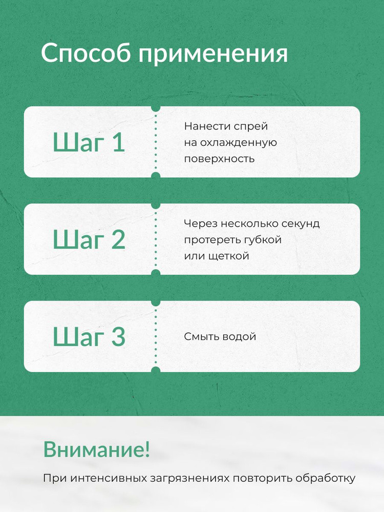Способ применения: нанесите средство от жира на охлажденную очищаемую поверхность и оставьте нa несколько секунд. Далее протрите губкой или щёткой и смойте водой. При интенсивных загрязнениях обработку необходимо повторить.